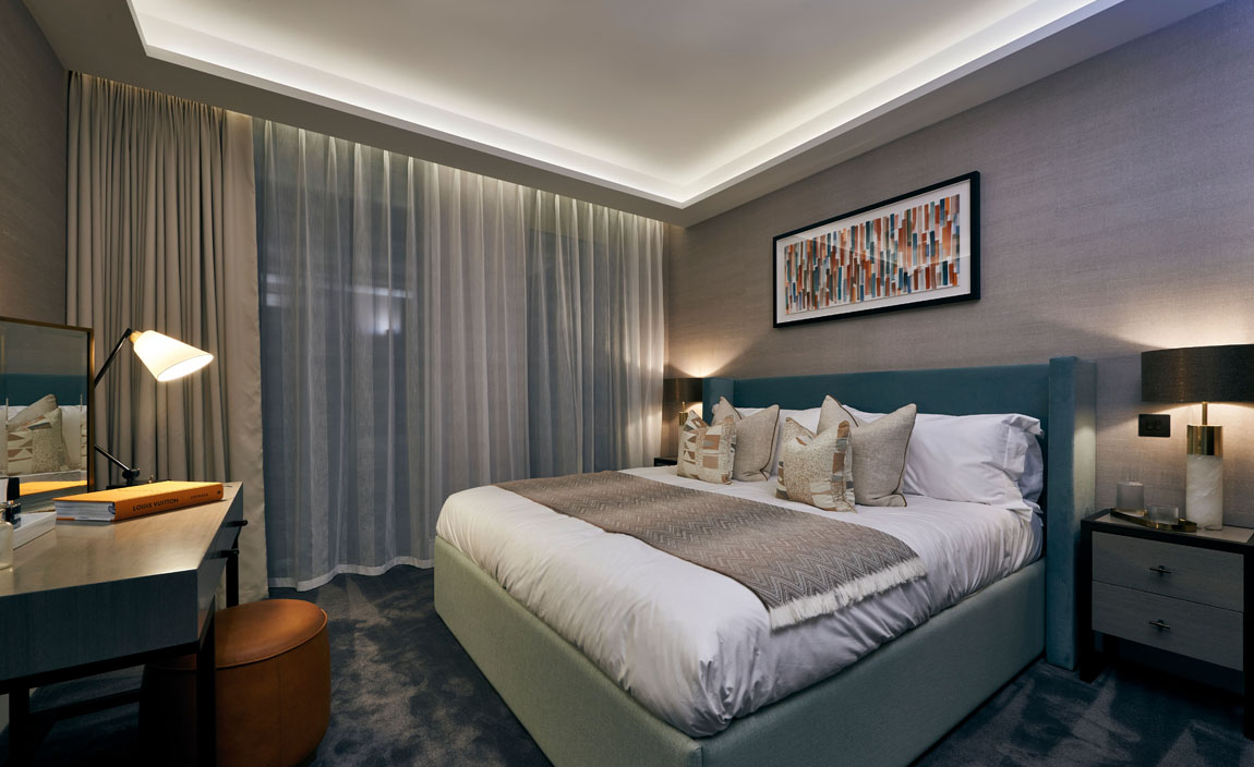 Concealed Volans LED dimmable coffer lighting in the living room and bedroom ceilings illuminate these principal areas with a warm white glow, whilst a hidden strip in the curtain pelmets adds a touch of finesse to the scheme.