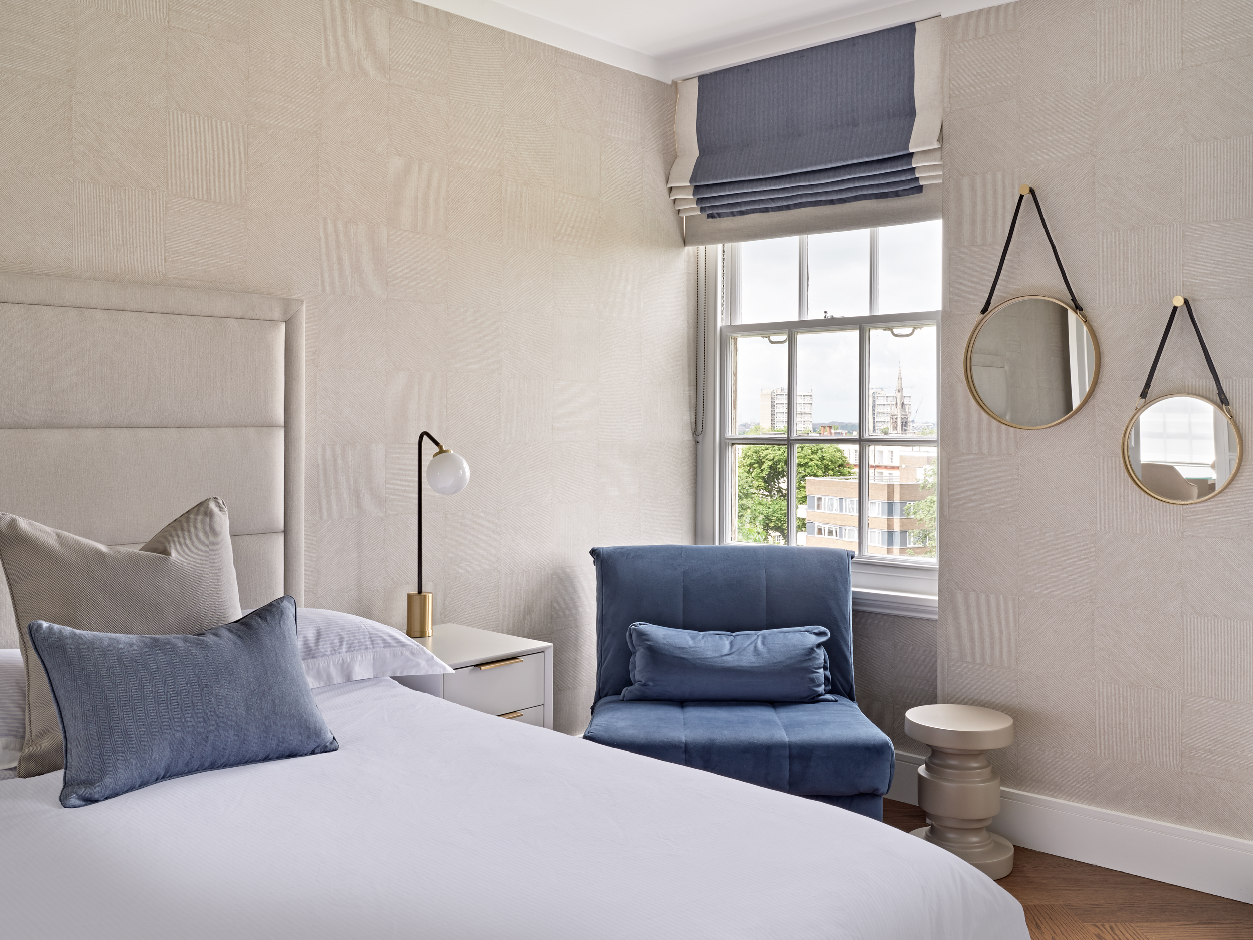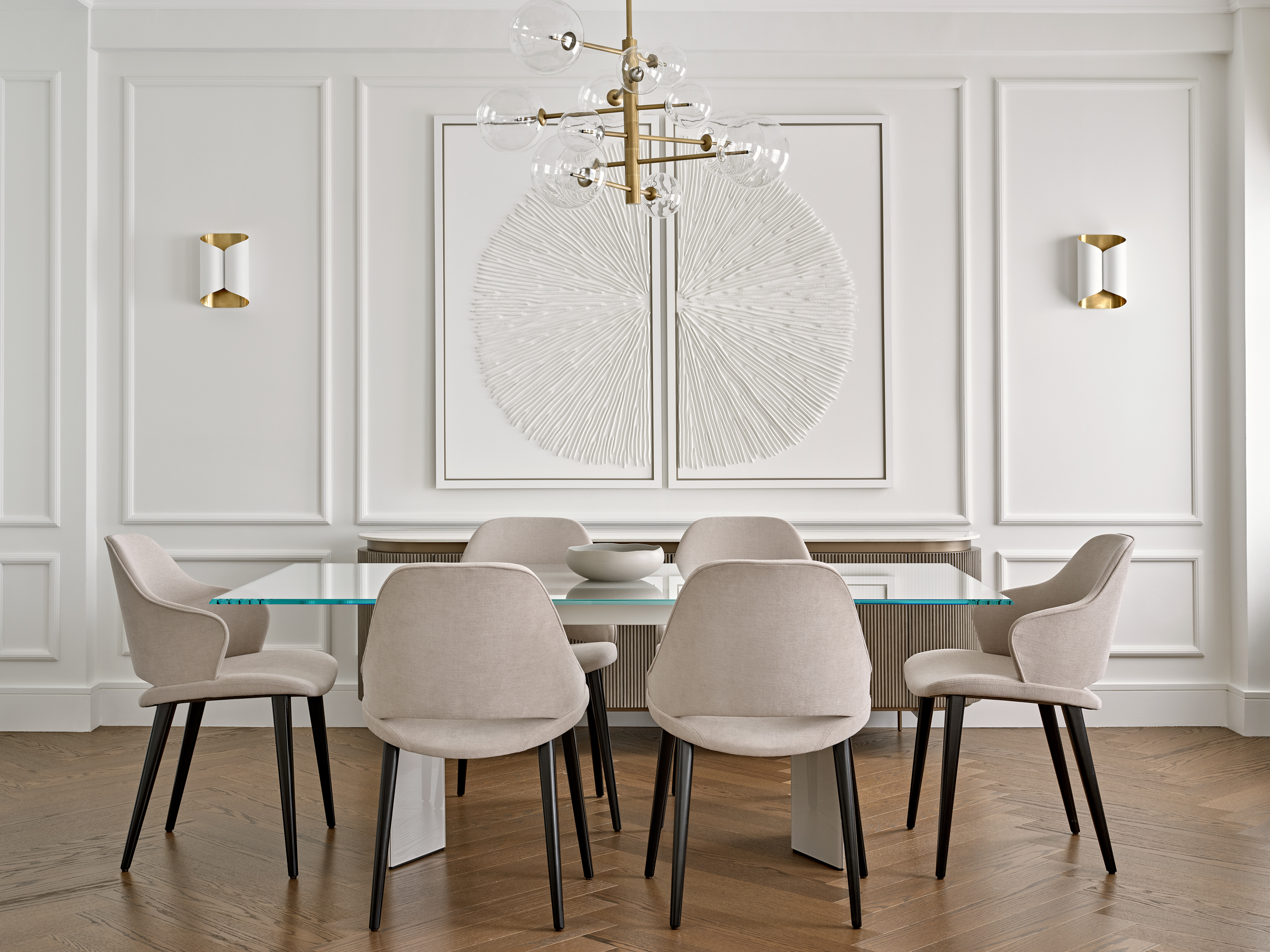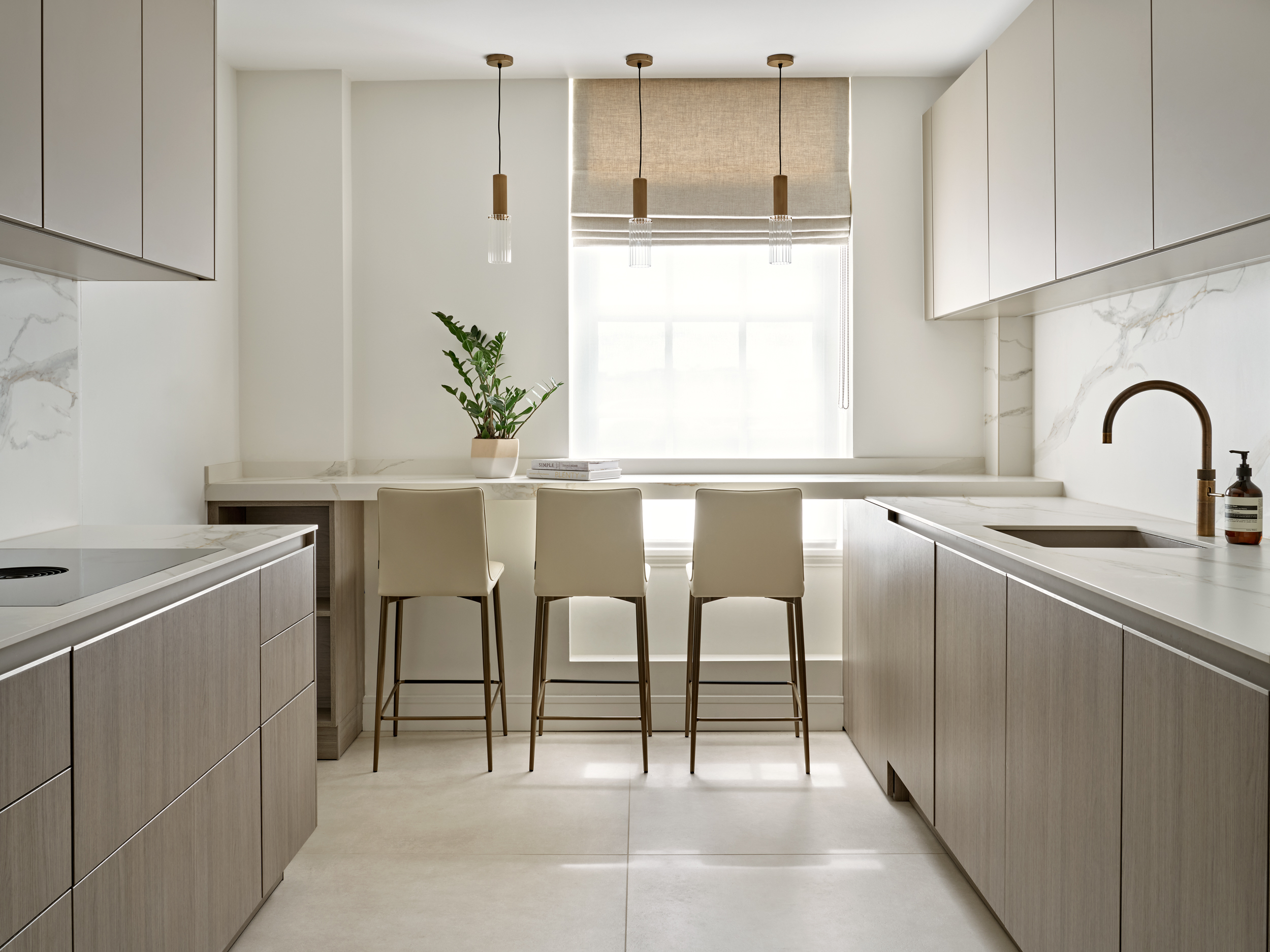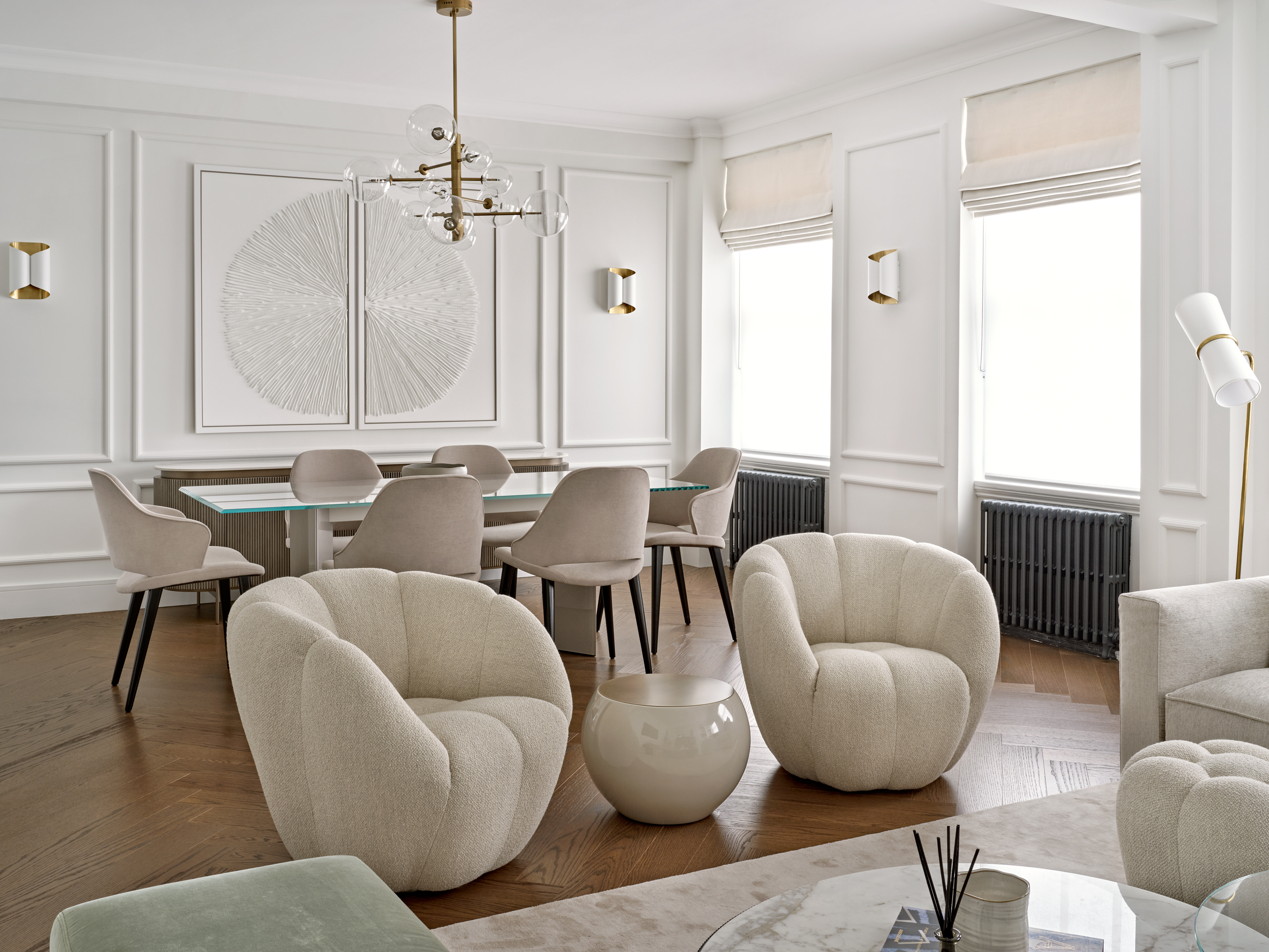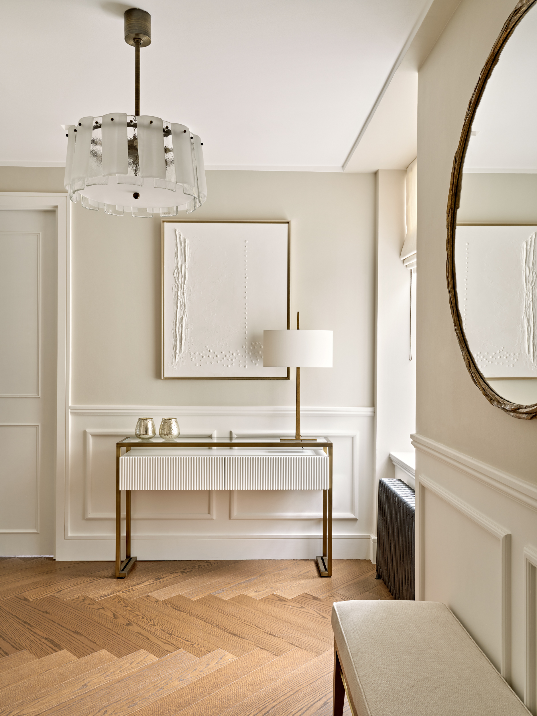 It was essential for the rooms to feel bright and airy, filled with natural light and enhanced by classic architectural details, we added intricate mouldings to the walls and doors and restored the existing herringbone flooring. The design features a sophisticated, warm neutral palette combined with a variety of textures, alongside marble and brass elements.