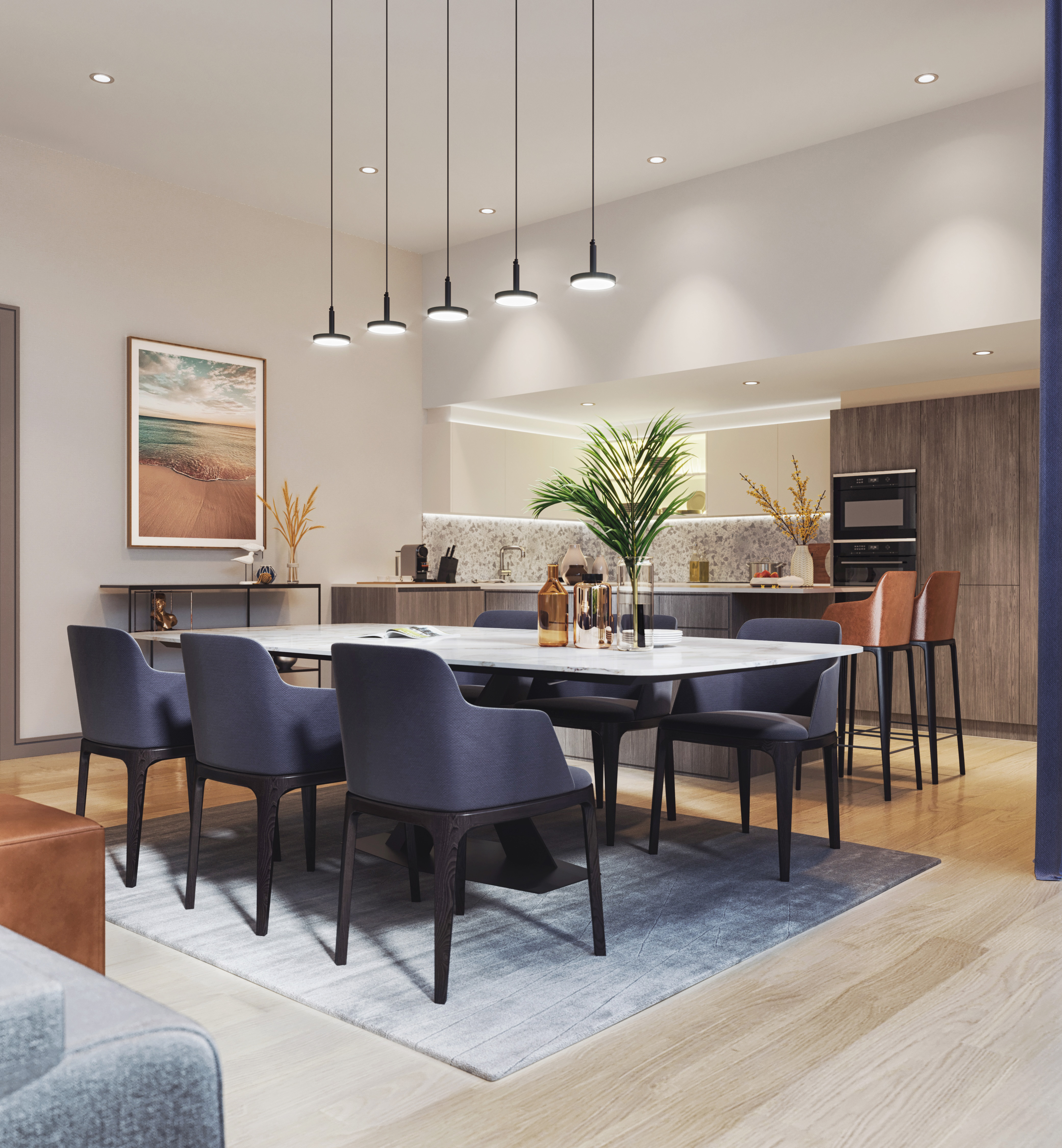 The St Pancras project is a two-bedroom apartment with open-plan kitchen and living room, designed by us, emphasising a sophisticated yet functional environment. The spacious living room with it's high ceilings provided an opportunity for us to create bespoke fitouts, including tall shelving units on either side of the wall to accentuate the height, balanced by a low, horizontal unit at the centre to avoid a heavy, monumental look. With the abundance of natural light and open space, we incorporated rich wood veneer and blue tones to add depth and warmth. Each piece of furniture was designed by Filiz Capur and manufactured by our sister company, ensuring a cohesive and high-quality finish. We added brass details and thoughtfully positioned lighting throughout, enhancing the design elements and ambiance of the space.