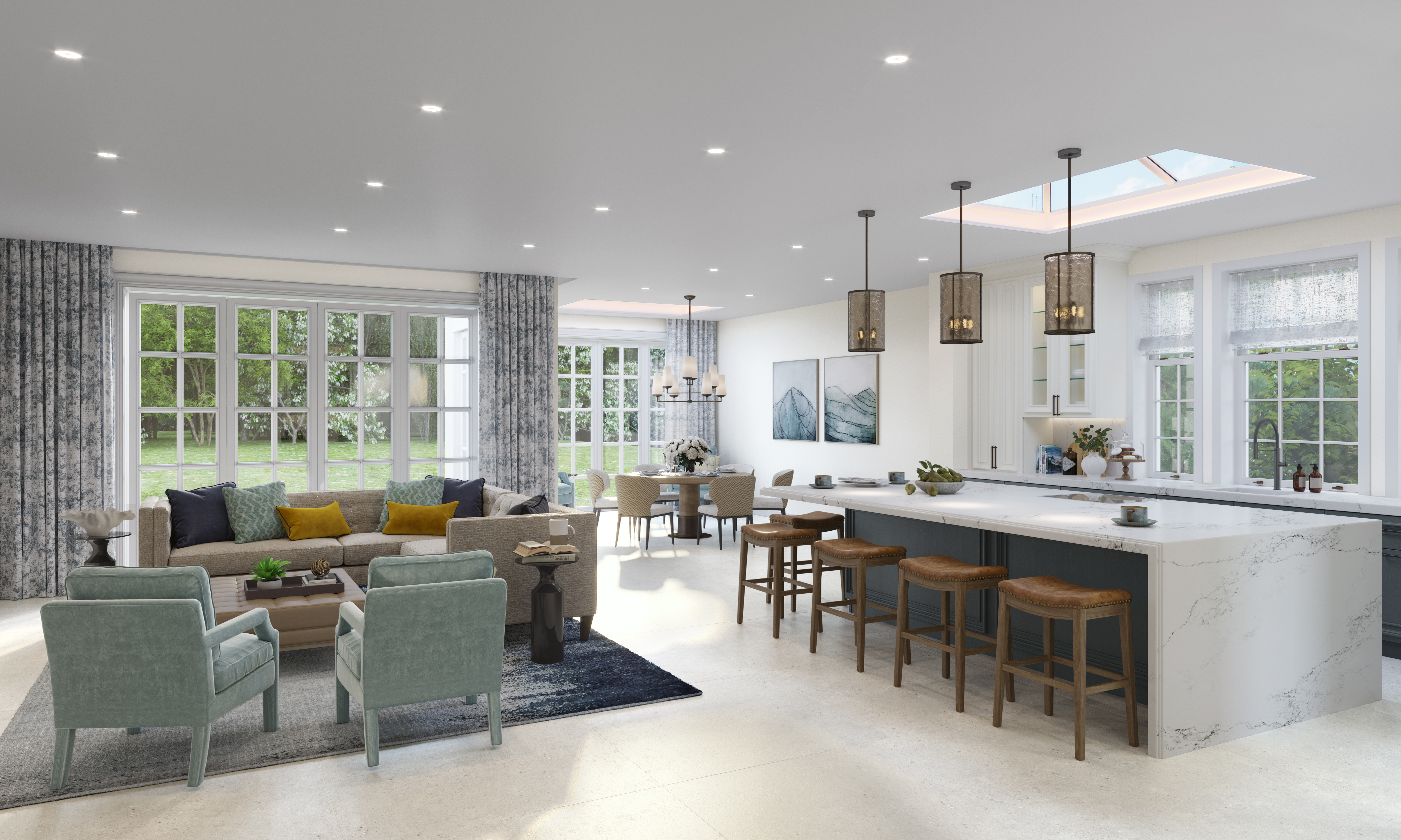 You are here: Q Design House project Surrey Family Home See Q Design House profile This beautiful home is designed for a family combining luxurious and classic elements with contemporary features. Gallery Large and welcoming entrance hall with feature artwork and furnishings Spacious master bathroom with soft lighting, perfect for relaxation in the standalone bathtub Open plan living space with pops of colour from statement armchairs Master bedroom scheme in contemporary style Bright and airy open plan kitchen and dining area with contrast panelling Generously sized kitchen island with beautiful natural light