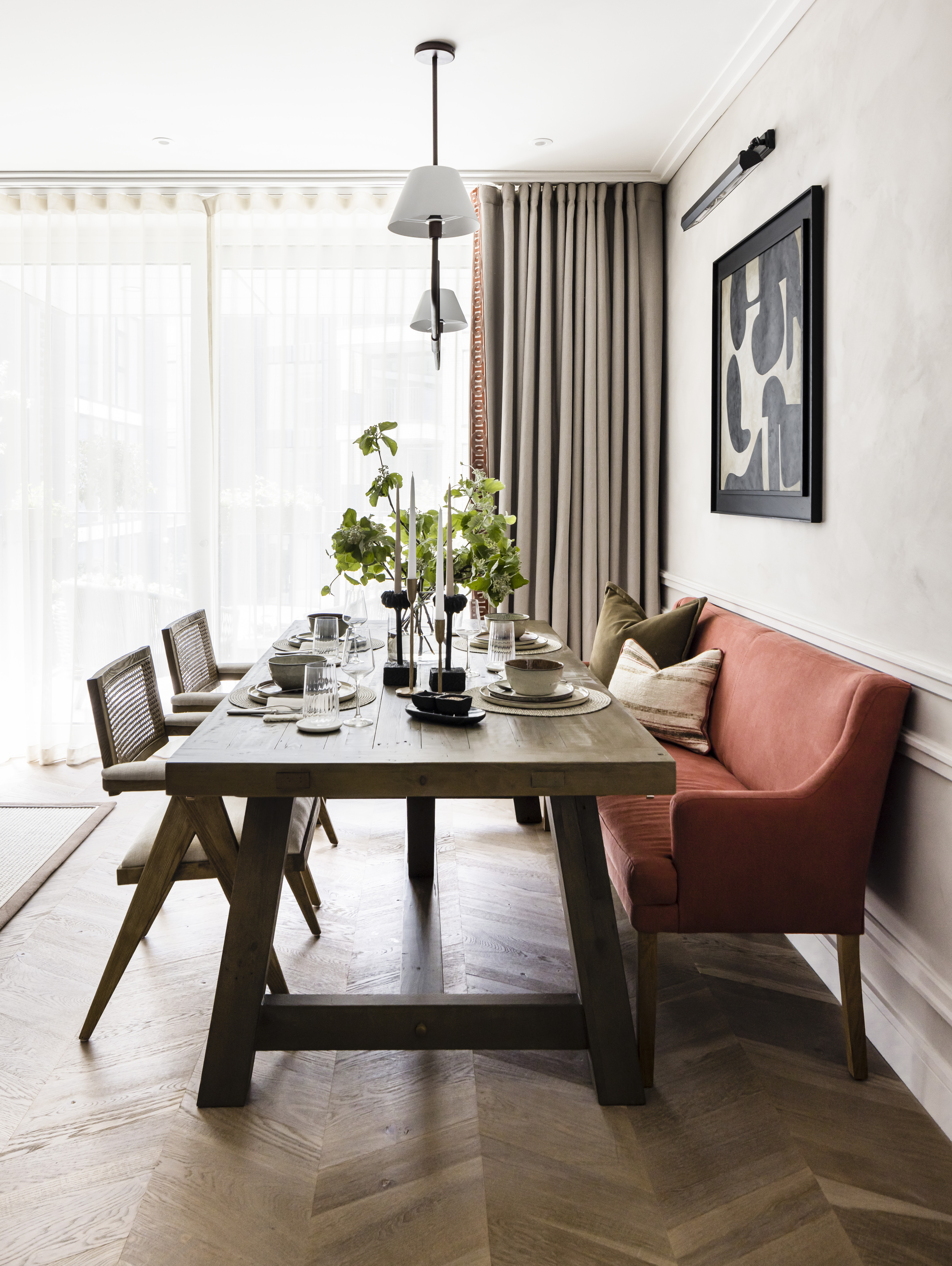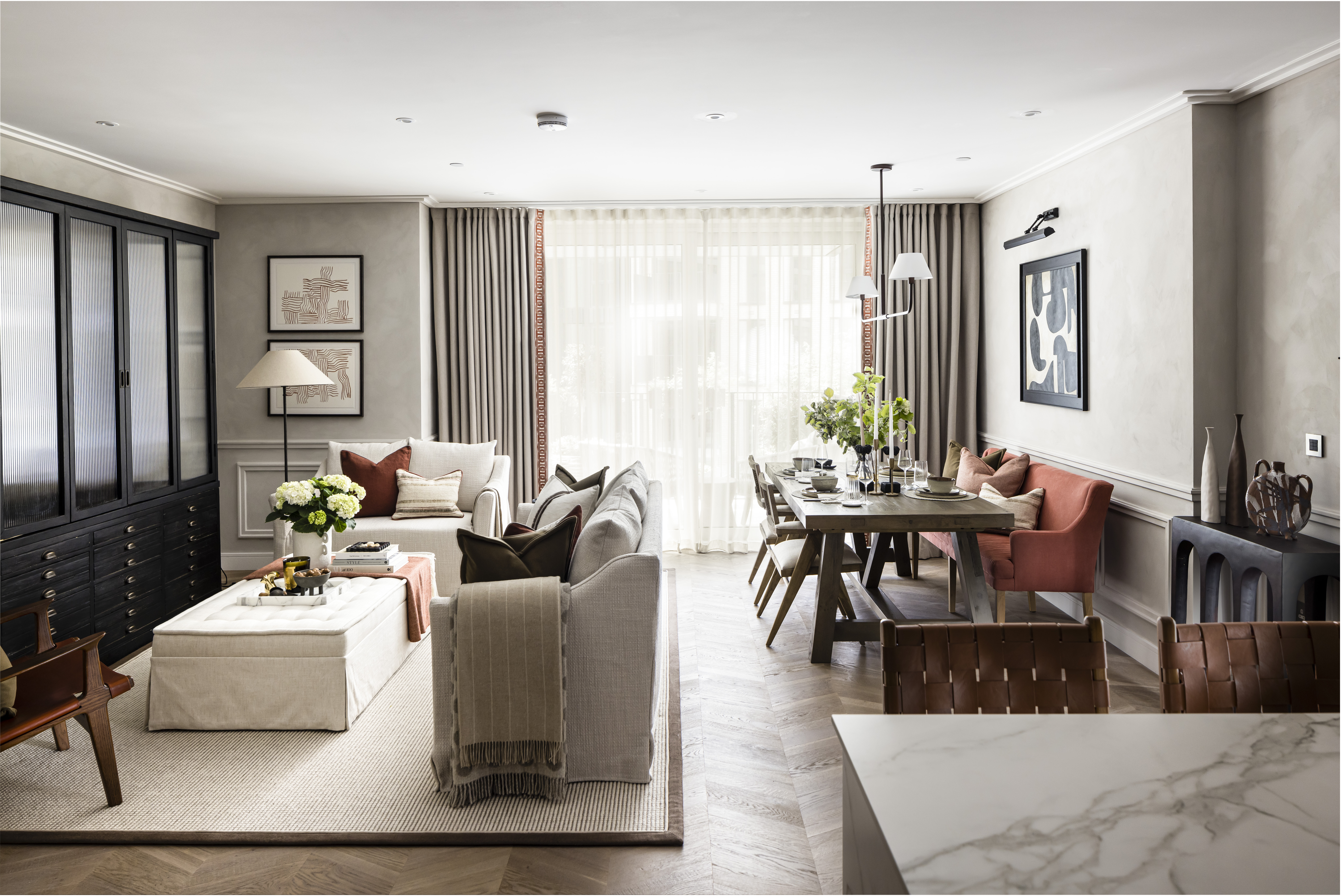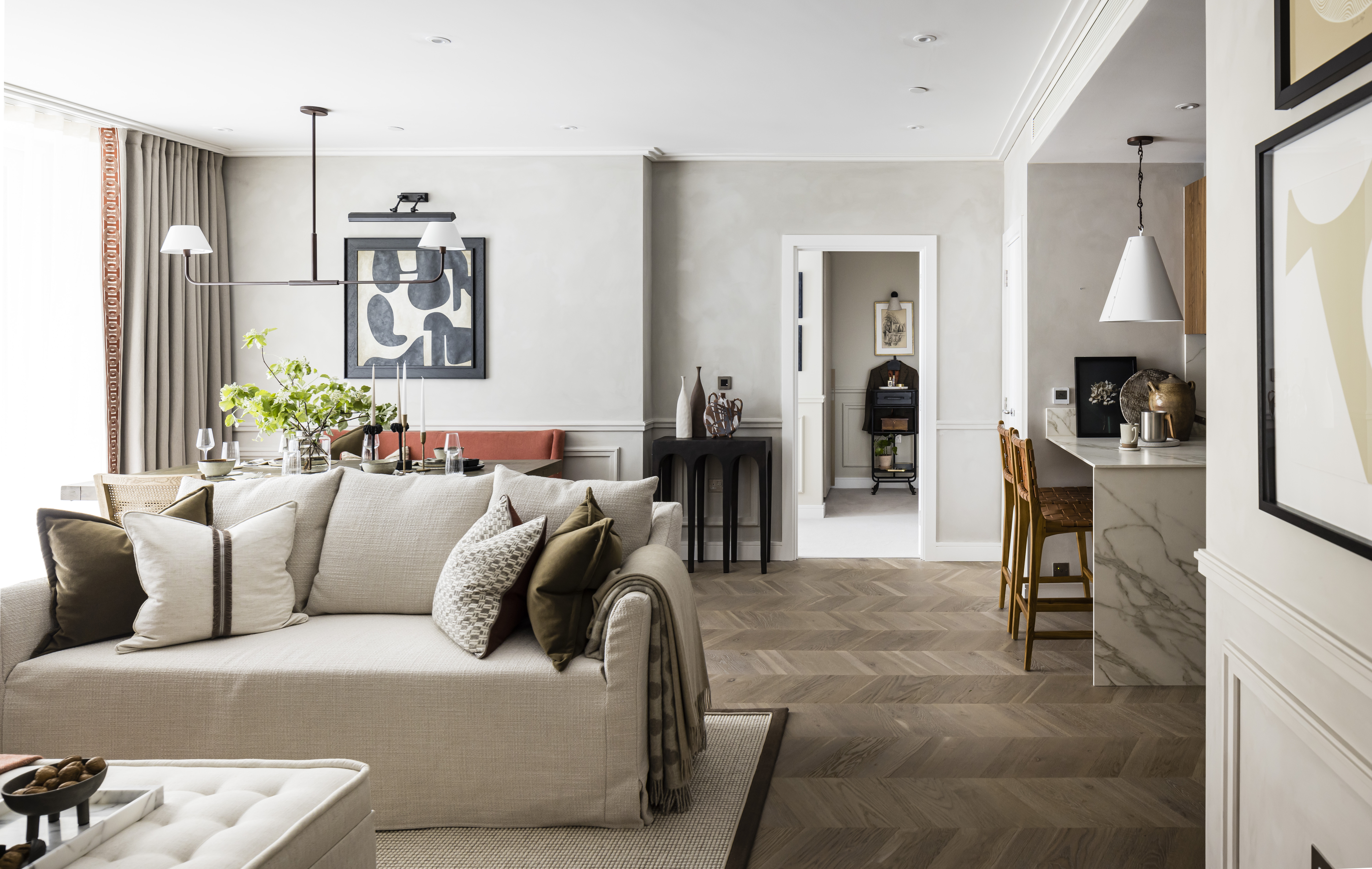 Honky were commissioned to design this two-bedroom garden facing apartment for their Client. The brief was to create an elegant and inviting space with a contemporary palate and classical detailing.