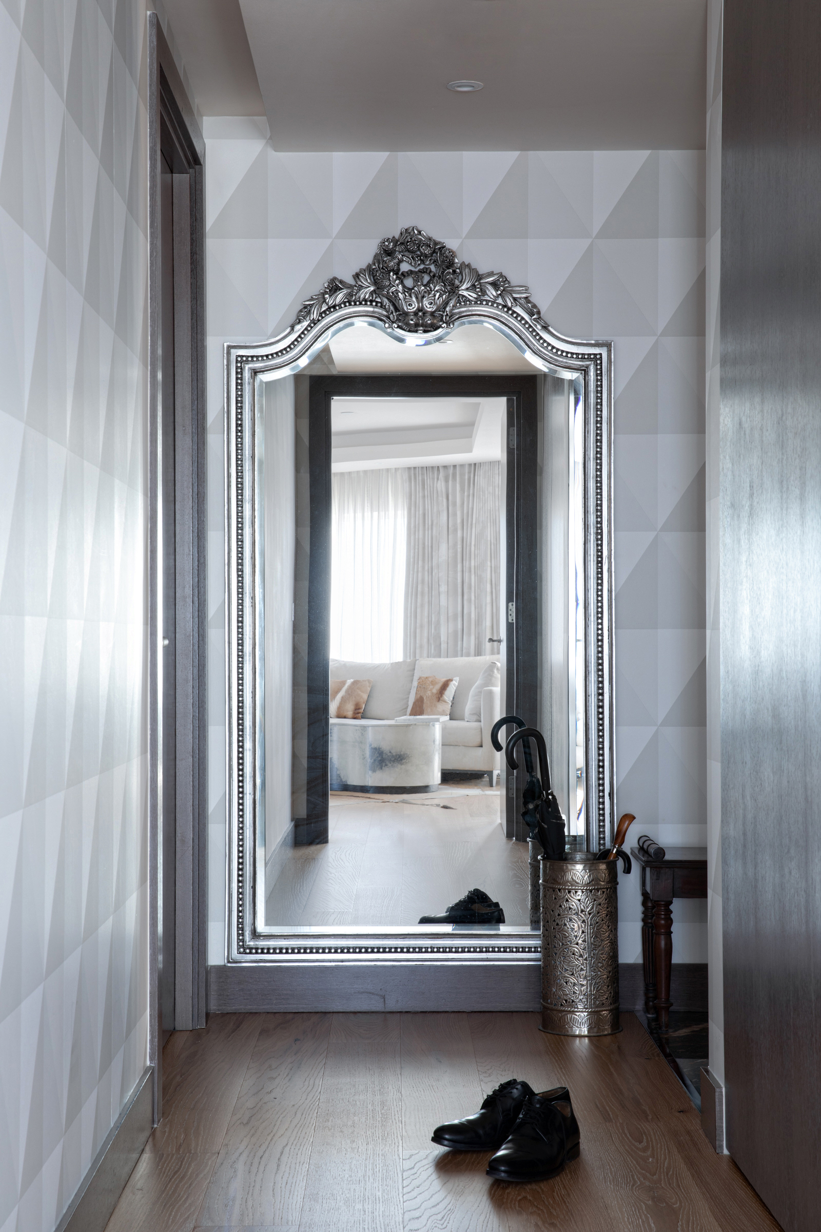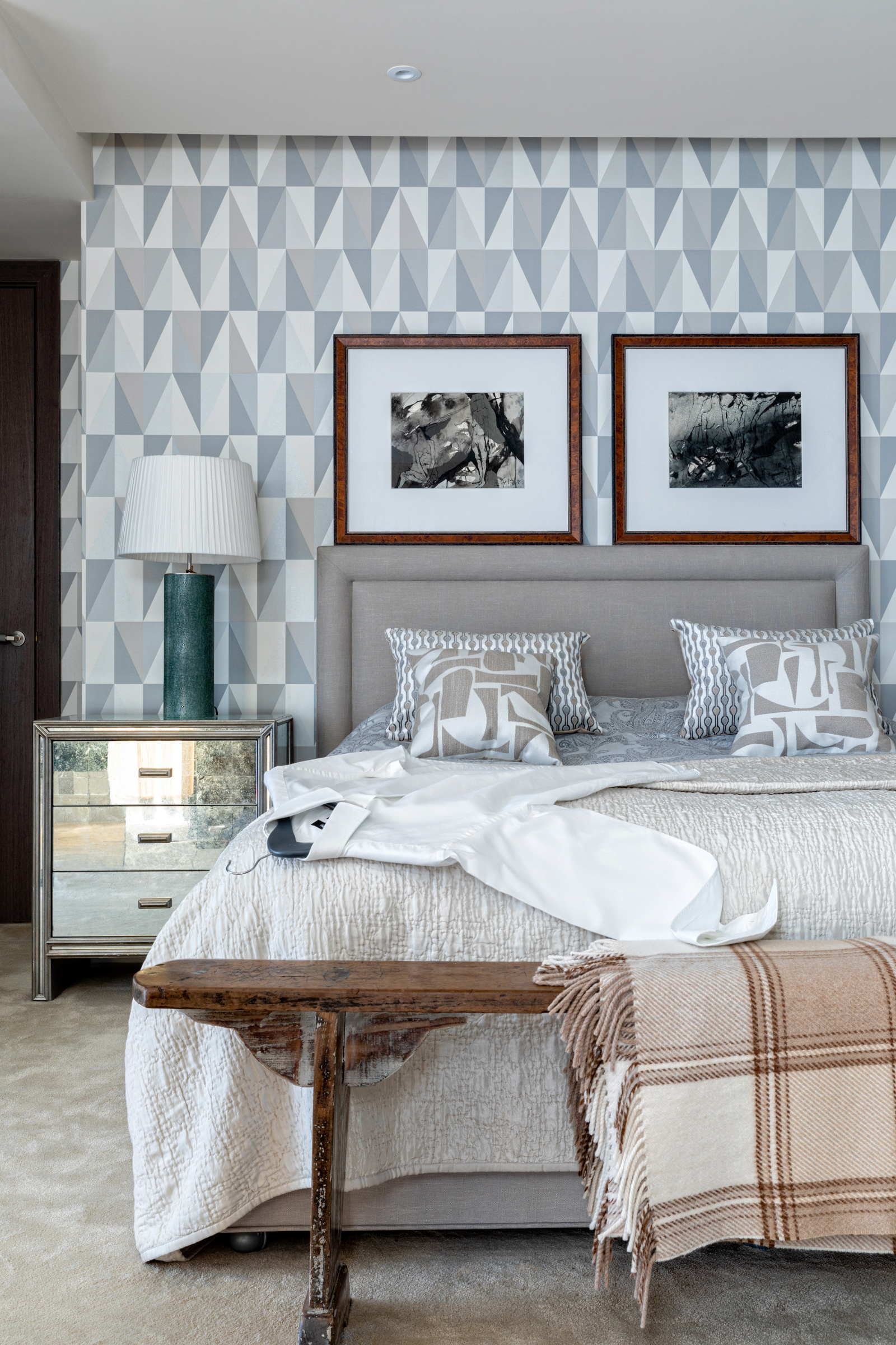 We chose a neutral colour scheme with geometric pattern wallpapers. Using an occasional accent turquoise colour and a burgundy/pink colour. These uplifted the monochrome background, making the space less formal. We used a variety of antique storage pieces in every room, picking them at an auction, and added a rough country bench for the Master bedroom which fitted nicely with the rest of room decor.
