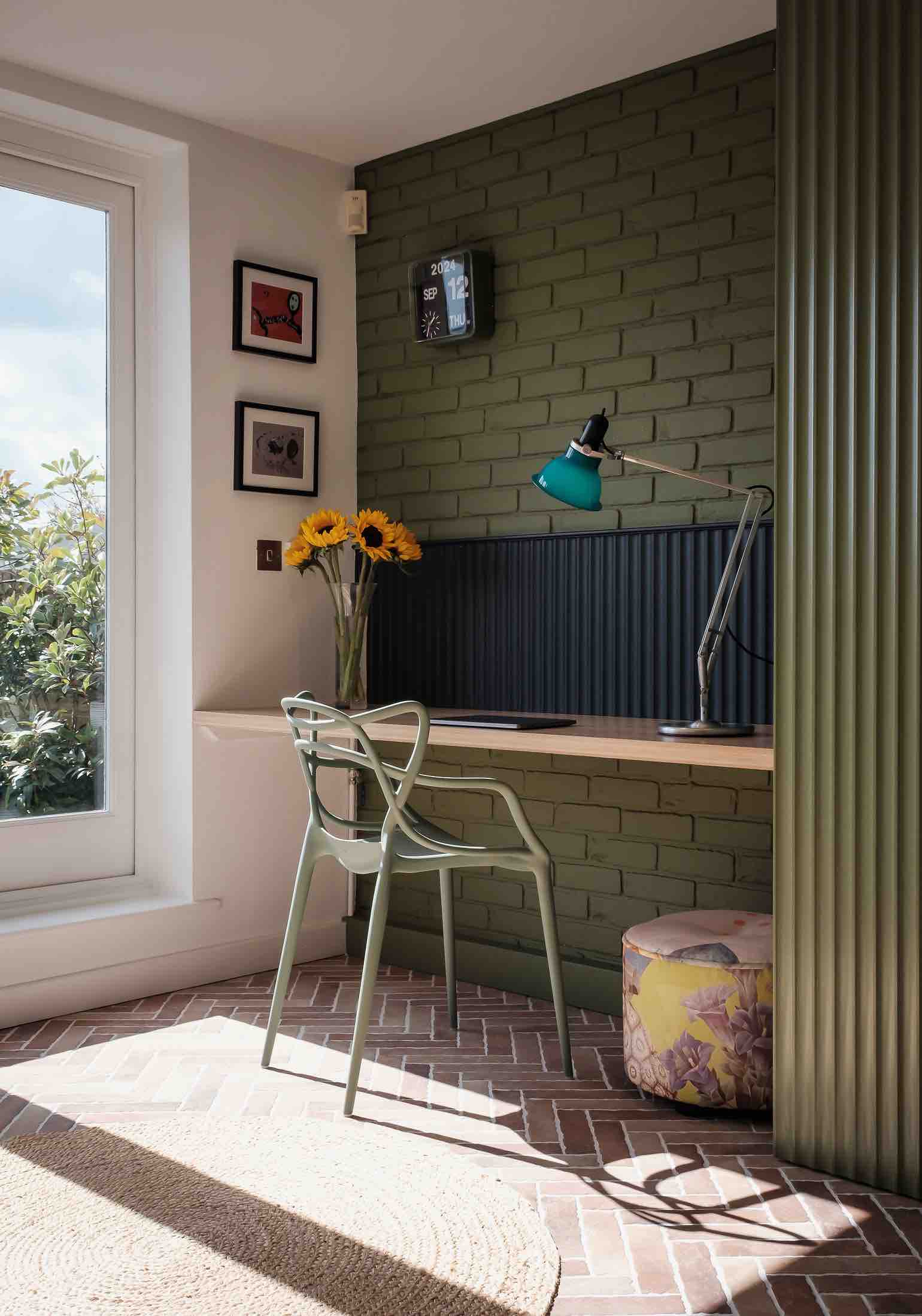 For fabric dyes and paints, I needed to ensure bleaching from the intense sunlight wouldn't happen. Where tall kitchen storage had previously been, a desk area was incorporated and as the boiler couldn't be moved - it was disguised within bespoke joinery. Useful eaves storage was also added. The exposed brickwork was kept, minimising the need for additional materials. The skeiling felt like it needed to be decoratively treated to include the short wall below. My clients were happy for this to be bold lush leafy mural, with a slightly clashy lush print on the modular lounge seating below. Coupled with rattan and seagrass woven finishes and a beautiful terracotta tiled floor laid in a herringbone pattern (which will extend onto the roof terrace in the next phase), it's worked out really well.