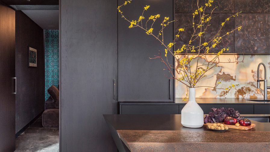 The five-metre island is clad in black granite, fabricated and crafted to create an abstract 3D geometrical form. An integrated breakfast bar runs the island’s length, sitting flush with the worktop and tapering inward before disappearing. Cabinetry in dark-stained timber and acrylic lacquer paired with black granite worktops create a dramatic and monochromatic design. The wall cabinetry and breakfast bar are hand-finished in textured copper metal. Copper accents lift the palette, adding texture, warmth and an organic aspect to the space. The striking feature back panel is individually sourced Jade Onyx, with natural, earthy green and copper tones throughout. At night, the LED backlighting illuminates the panel to produce an atmospheric glow and reveal the translucent beauty of this precious stone. Hidden doors open to reveal two secret rooms on either end of the kitchen. A walk-in larder and additional worktop space provide generous pantry storage, while the snug home cinema offers a cosy space to enjoy the latest movie releases from the comfort of home.