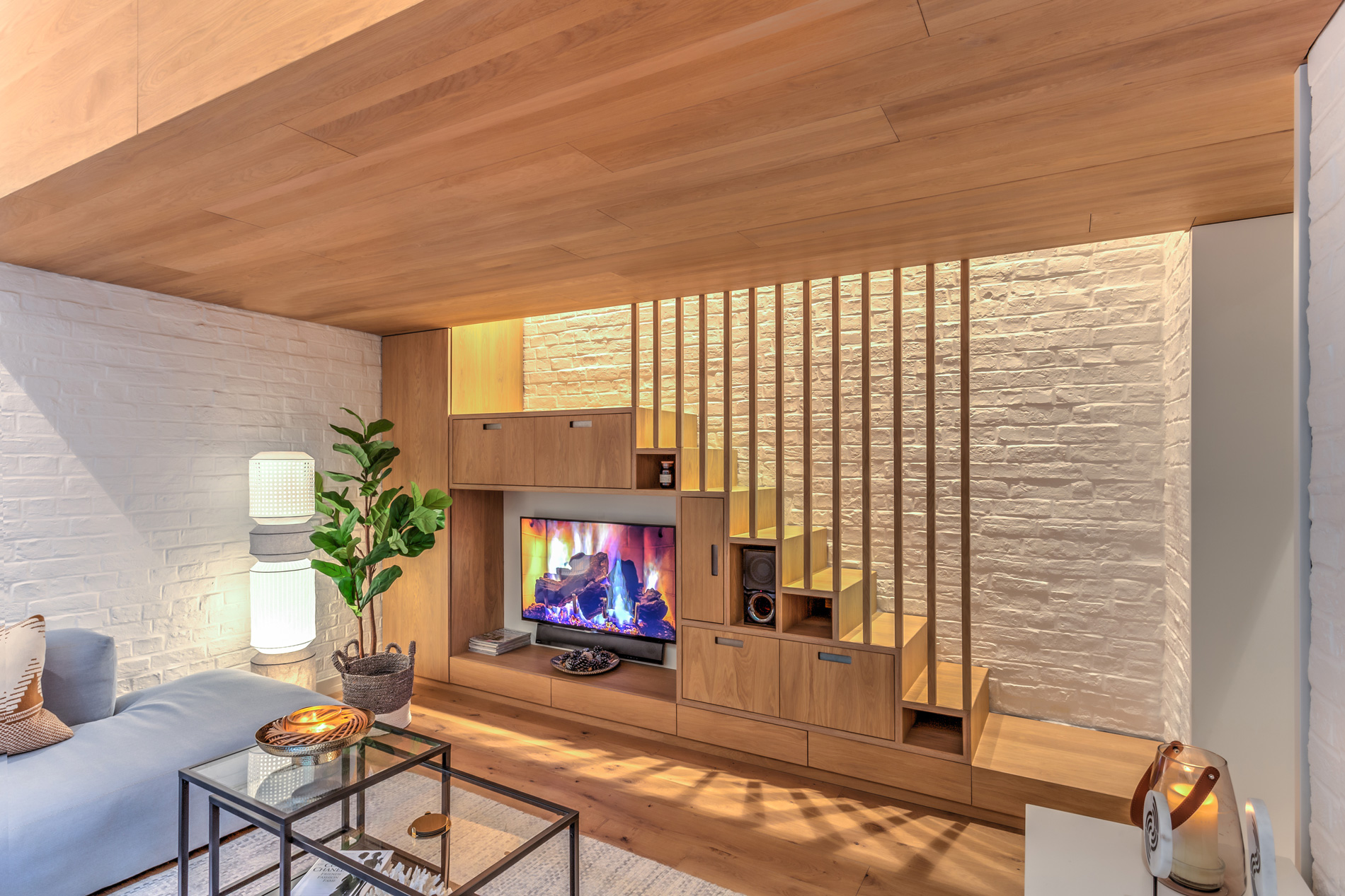 This studio flat in Gloucester Road was destined as a holiday let. The interior decor complements the contemporary Scandi character of the space. Large sofa from Danish company Hay adorned with richly textured tribal cushions invites to put your feet up and relax. Media unit has been built in the staircase leading to the mezzanine sleeping platform above.