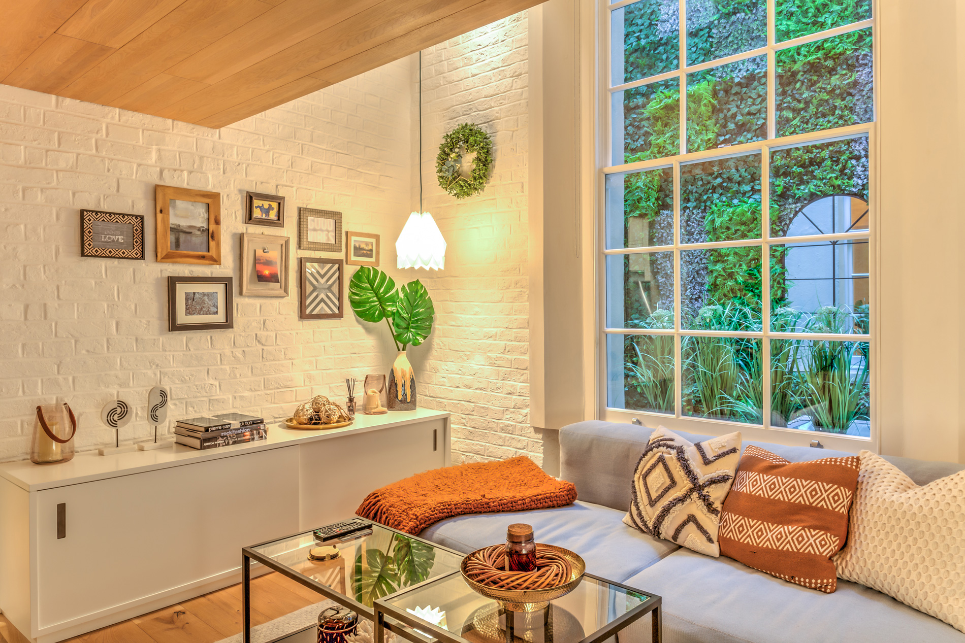 However cosy the apartment became after our interior decoration, the real challenge was the fact that the only window in the flat was looking out on a gloomy wall of internal light well. The flat, although bright, but could feel a little claustrophobic. So we installed a lush artificial vertical garden in the lightwell, with arched window mirror, which completely transformed the apartment giving it not only a lovely calming yet verdant view and an illusion of perspective and openness.