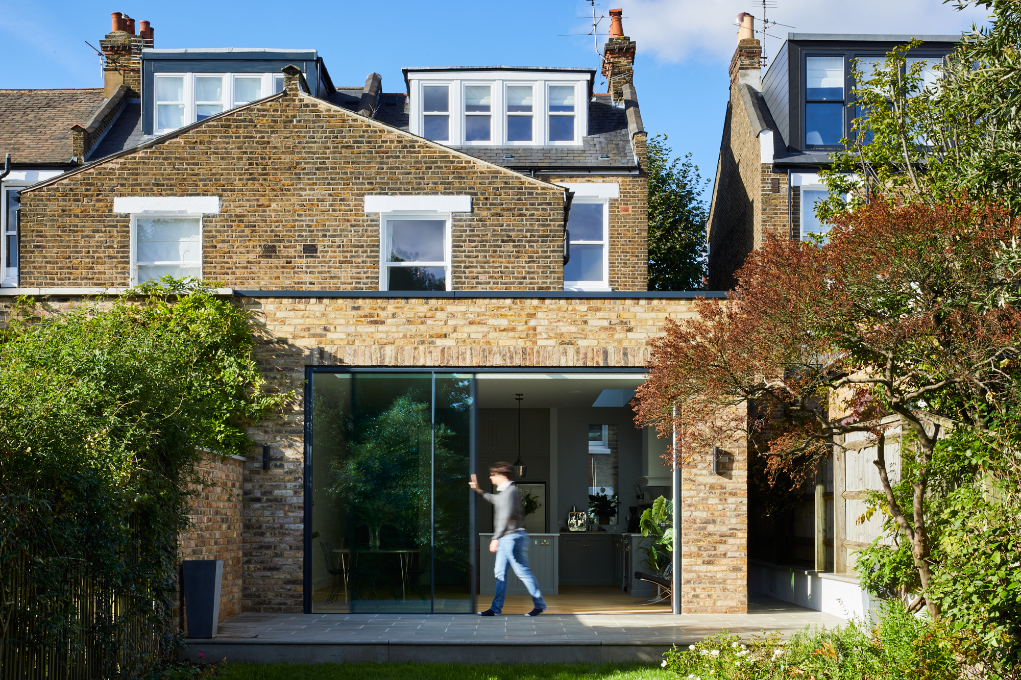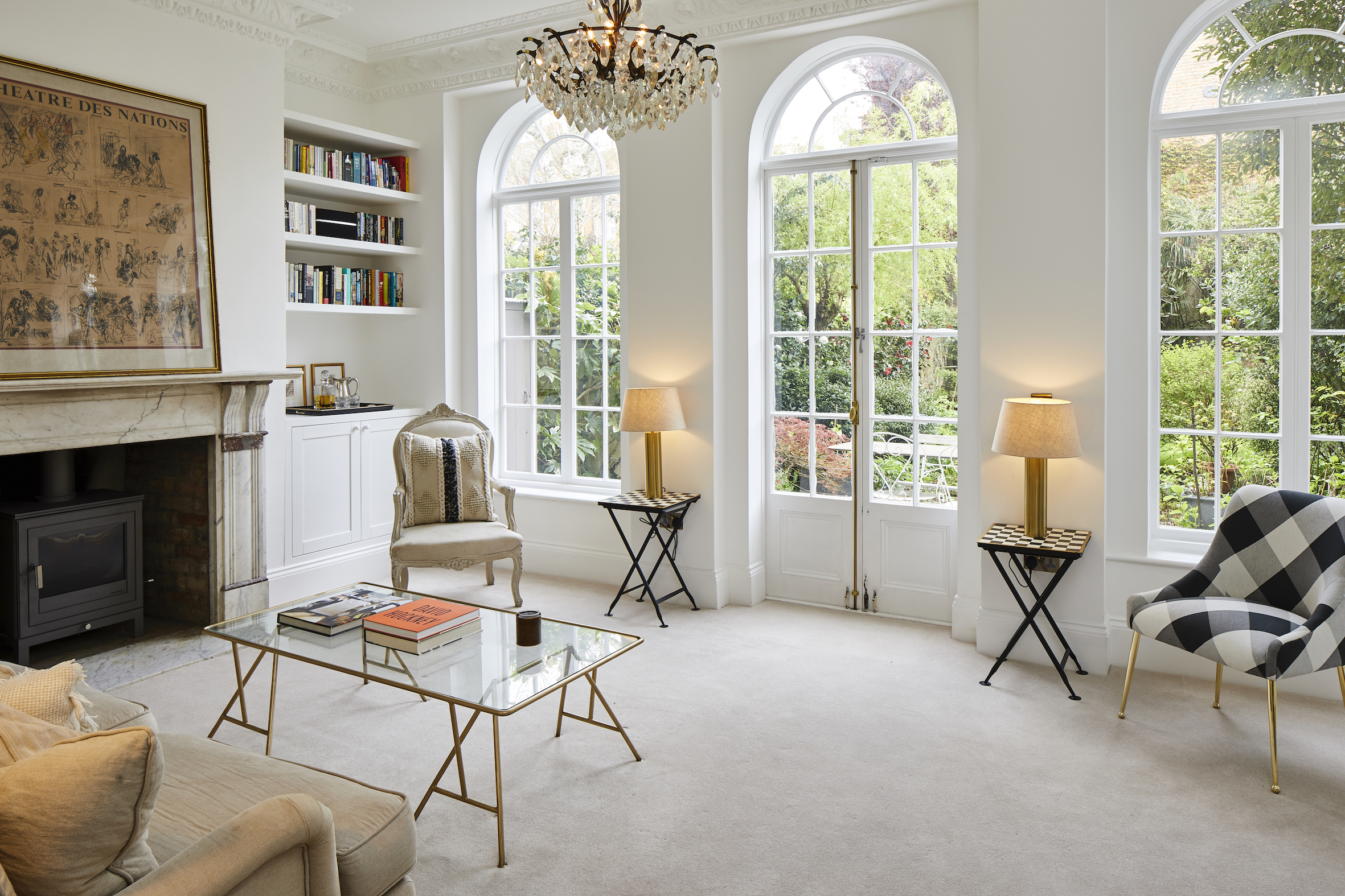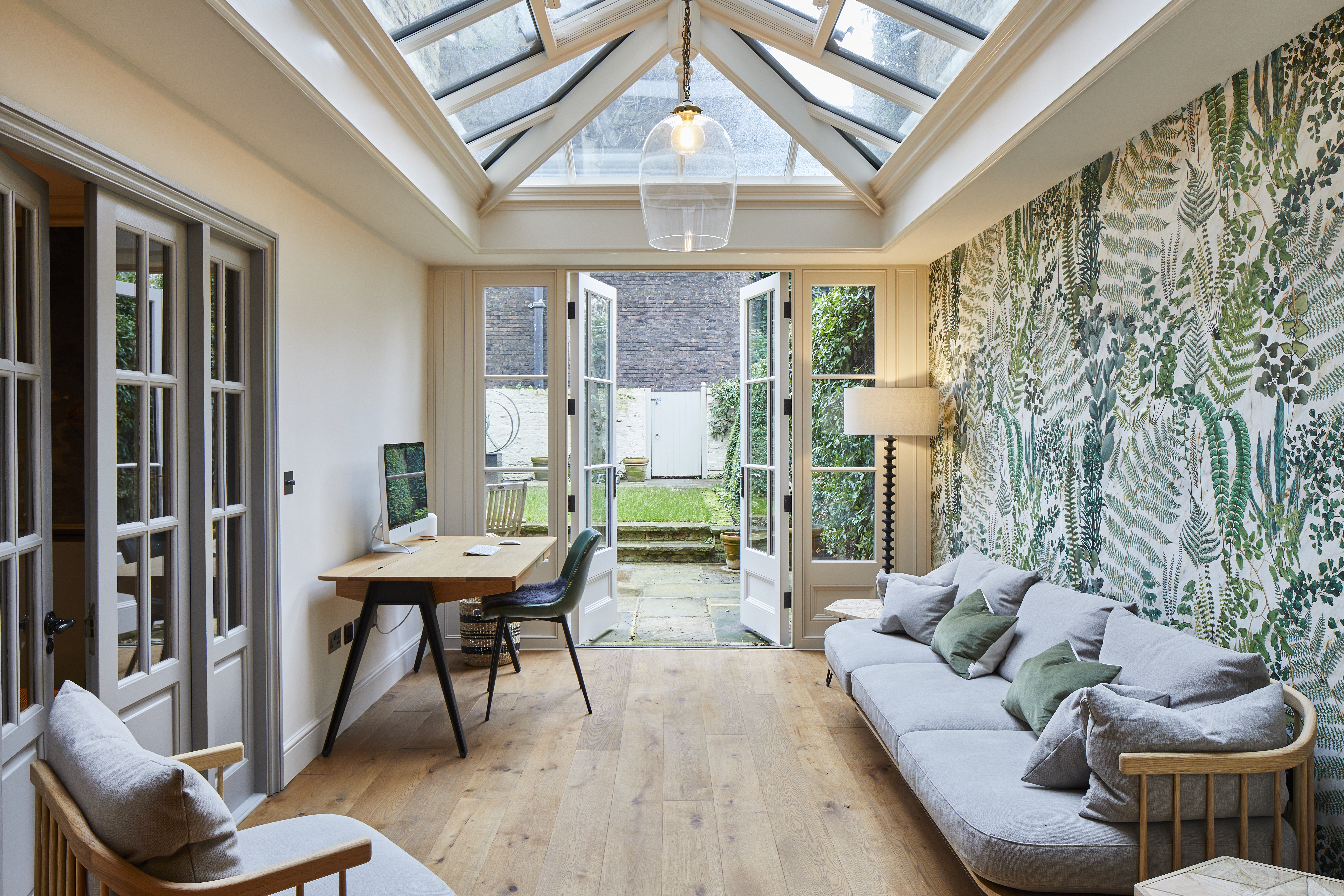 Hardwood floors in a herringbone pattern run throughout the entire ground floor. The existing fireplace surround was removed and a classic limestone mantle from Chesney's was sourced to act as a feature and focal point in the room. The tired and draughty French doors at the rear were also replaced with a contemporary sliding system, finished in Oak which was paired well with the flooring.