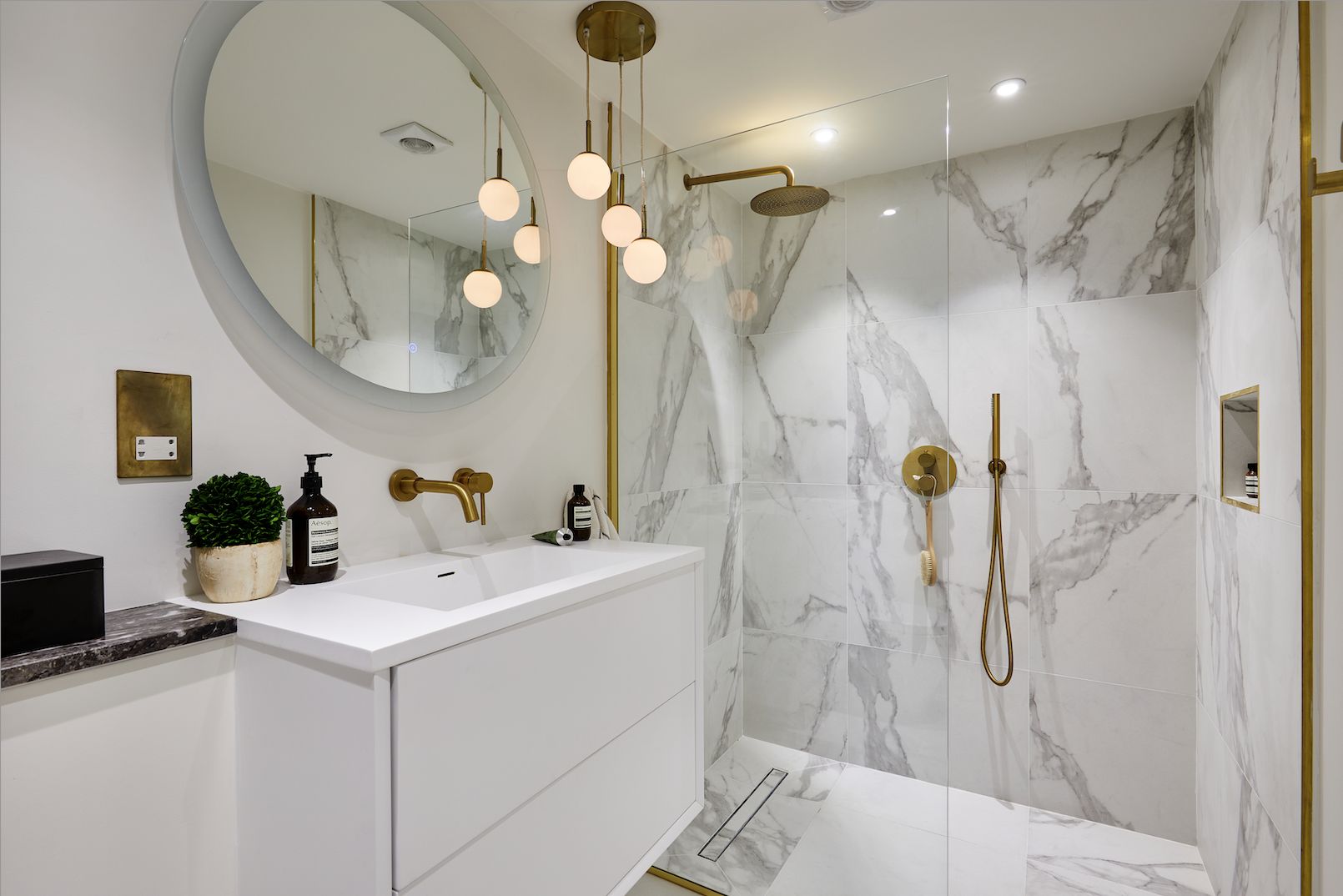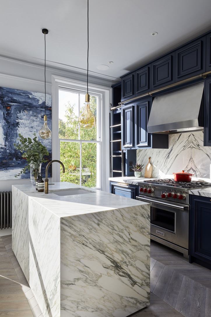 Bespoke joinery was designed and built throughout, including the kitchen. This was handmade in our workshop and was constructed of Ash door fronts, with the inside of the cabinetry finished in Walnut. A rich Calacatta marble was sourced for the worktop, with the subtle hints of gold and green in the stone being reflected by the brass handles and green of the overall scheme.