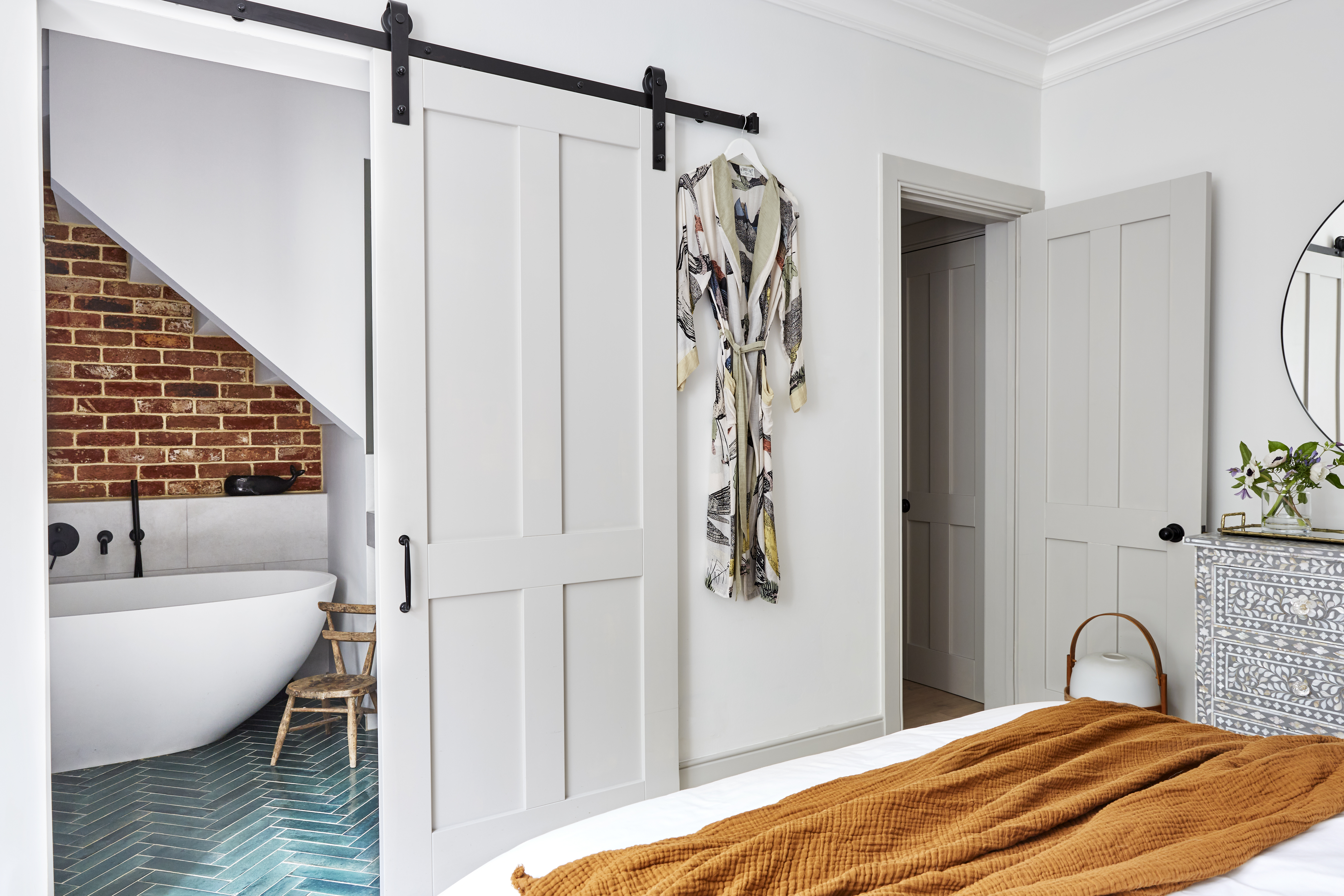 A creative reinterpretation of an awkward understairs layout in a classic southwest London basement and ground floor flat. We reworked a bathroom and guest bedroom configuration to create a generous main bedroom and ensuite, re-siting an existing entryway to allow for a generous shower and freestanding bath. Textural terracotta toned brick slips and matte black tapware introduce a softly industrial note, while the silhouette of the staircase is incorporated into the scheme. A newly designed bedroom features soft greys and warm russets. Upstairs, we also refurbished a cloakroom, picking up on the green and white tones of the family bathroom and added a new glazed door to the rear to channel in light.