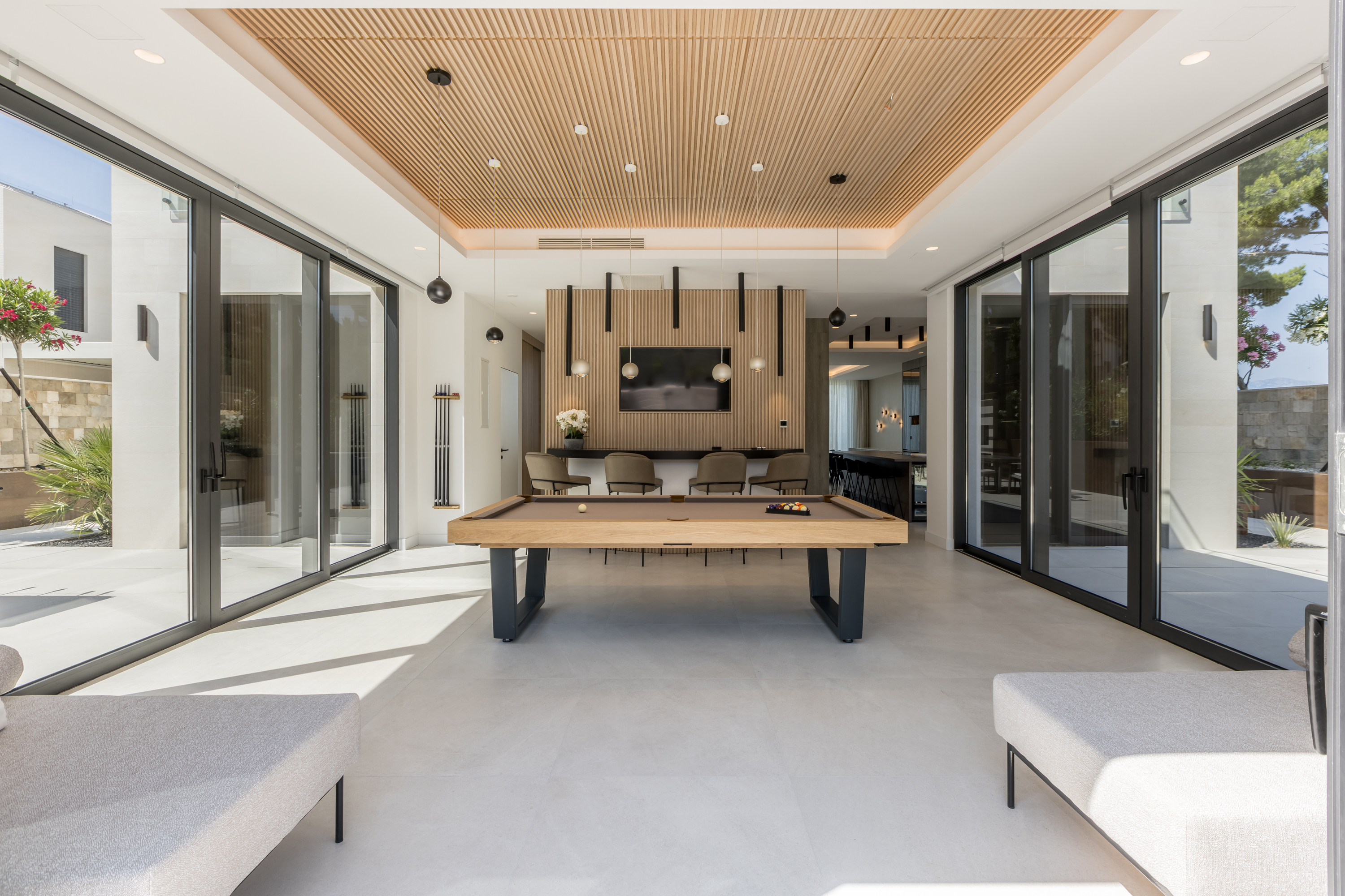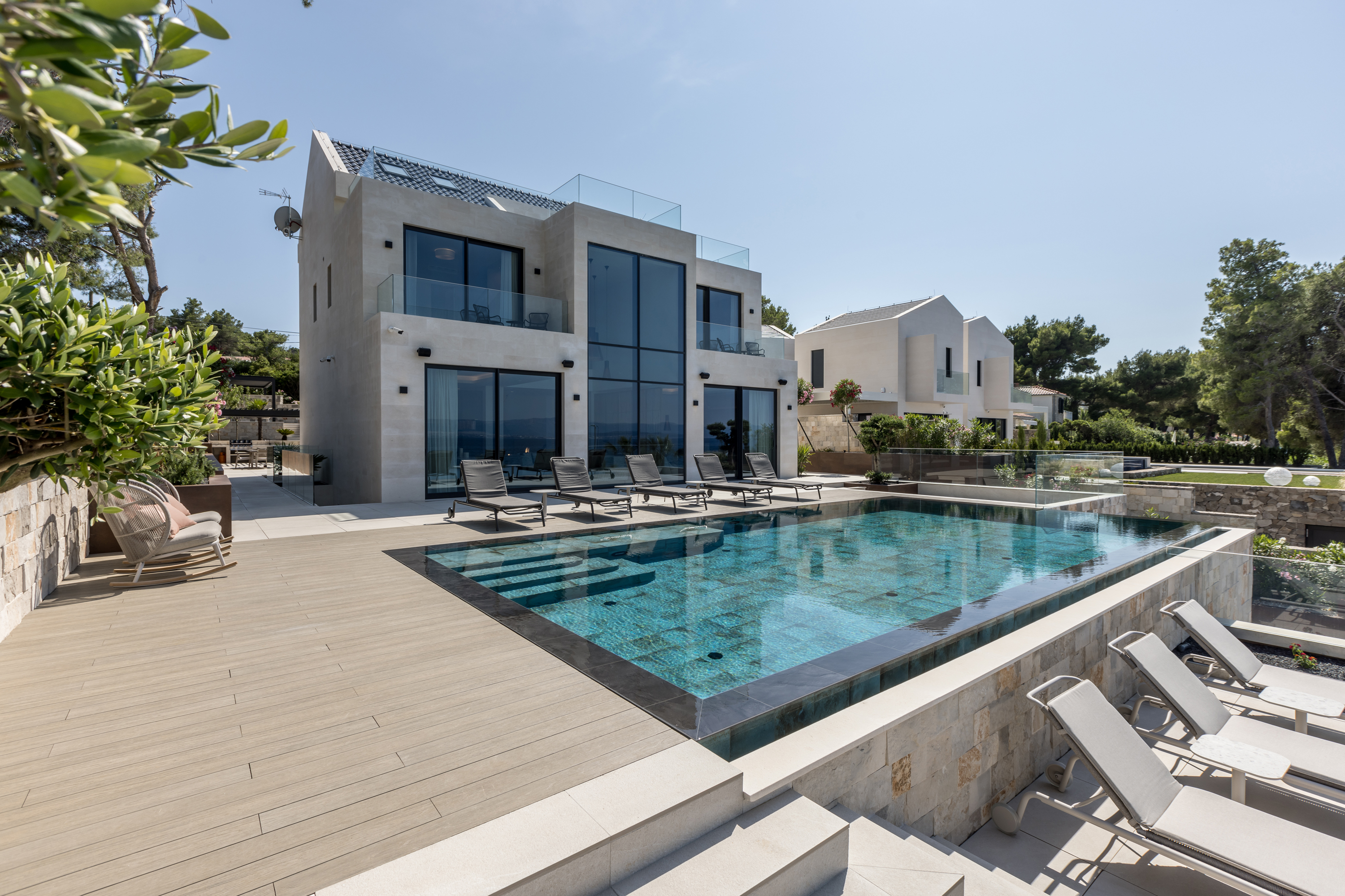 We visited site on the beautiful island of Brac, just off the coast of Croatia to immerse ourselves in the location. Overlooking the sea, the villa afforded beautiful views across the water to Split and whilst this was very much a seaside property, we took inspiration from the surrounding landscape using local stone and materials for our colour palette inside and out. Whilst the villa was designed to be suitable for the luxury holiday rental market, the space is primarily used as our clients second home complete with everyday essential spaces such as a home office and full equipped gymnasium.