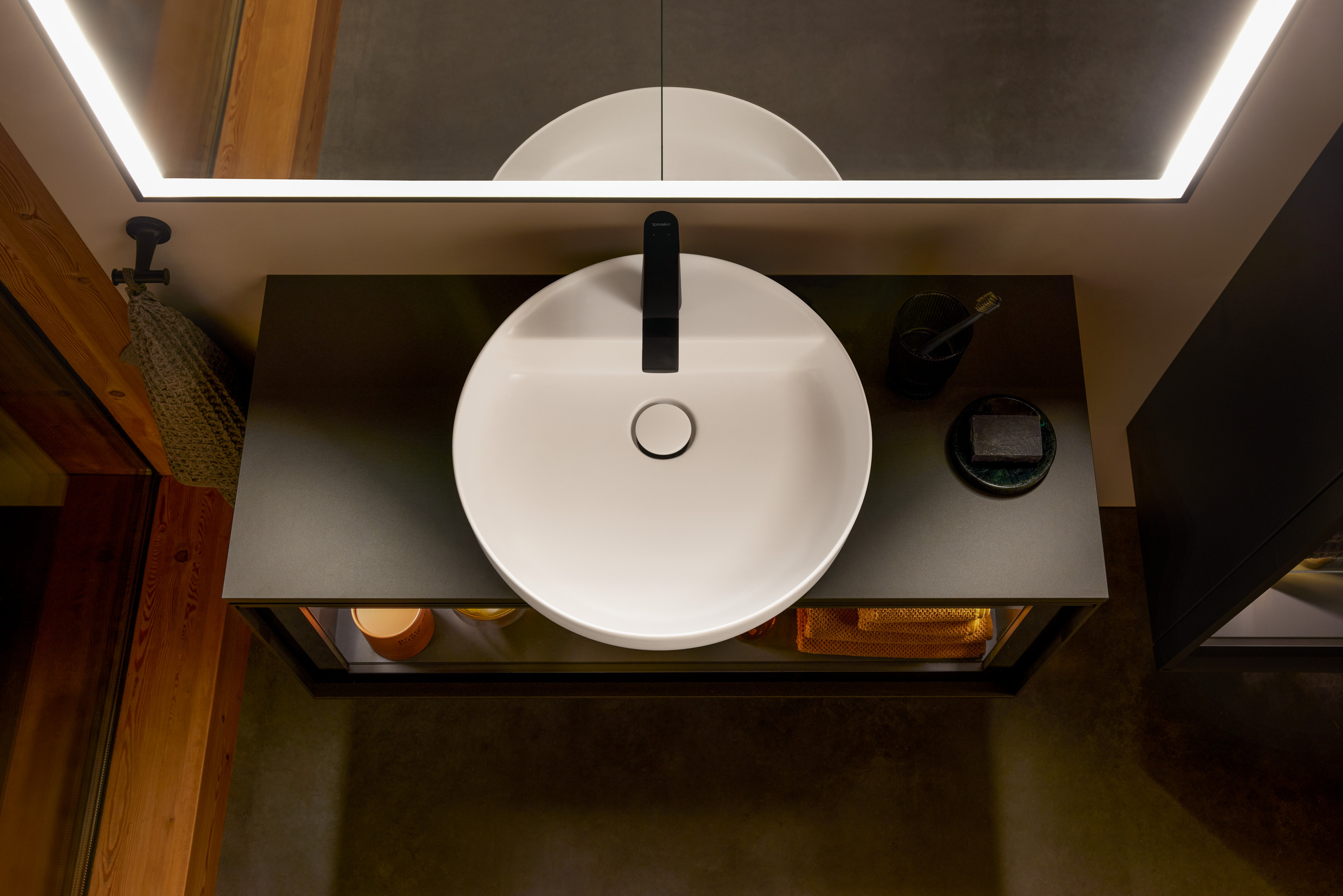 Christian Werner is a designer who lives and breathes the topic of bathrooms and sanitaryware. He has worked with Duravit on innovative bathroom solutions for many years. After six furniture projects he has now designed his very first washbasins – which interact with console vanity units and washbasin vanity units. The range juxtaposes materials with interesting visual and tactile qualities: while the washbasins manufactured using the mineral cast process are made from DuroCast UltraResist, the console vanity unit comes with a fine metal frame and a choice of fronts made from backlit glass, wood, or various décor finishes. The result is a natural-looking ensemble that radiates coziness. “The starting point for this design idea was a rigorous interrogation of the habits we take for granted. With Vitrium I sought to redefine the design of the bathroom and the associated routines. As well as the kitchen and living room, for me the bathroom, too, is a place of comfort and refuge,” said Christian Werner