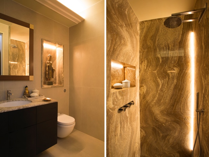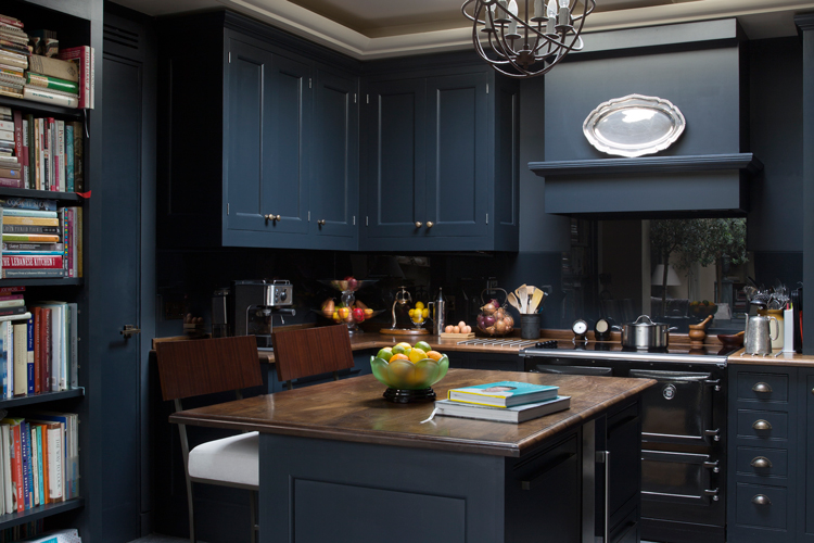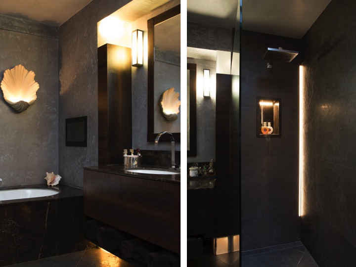 This project was a complete refurbishment of a penthouse apartment in the West End of London. The apartment was taken back to the shell, underfloor heating, polished plaster walls, wood floors with bronze inlay trim, and special finishes. The drawing room has bespoke bookcases made from walnut and ebony. It was important to show the mix of contemporary and 20th century furniture and artifacts with an early 18th-century portrait. The master bathroom walls have a polished plaster with acid effect finish, bespoke cabinetry in macassar ebony and an insert corner lighting in the shower. The kitchen is central to the entertaining area, with bespoke kitchen units painted in a dark grey, an Esse oven and a champagne fridge in the island. A large bookcase was required for the client's collection of cook books. The shower room had a beautiful marble shower surround, bespoke cabinetry, mirror with walnut and sycamore frame. The marble alcove was designed to place an antique buddha.