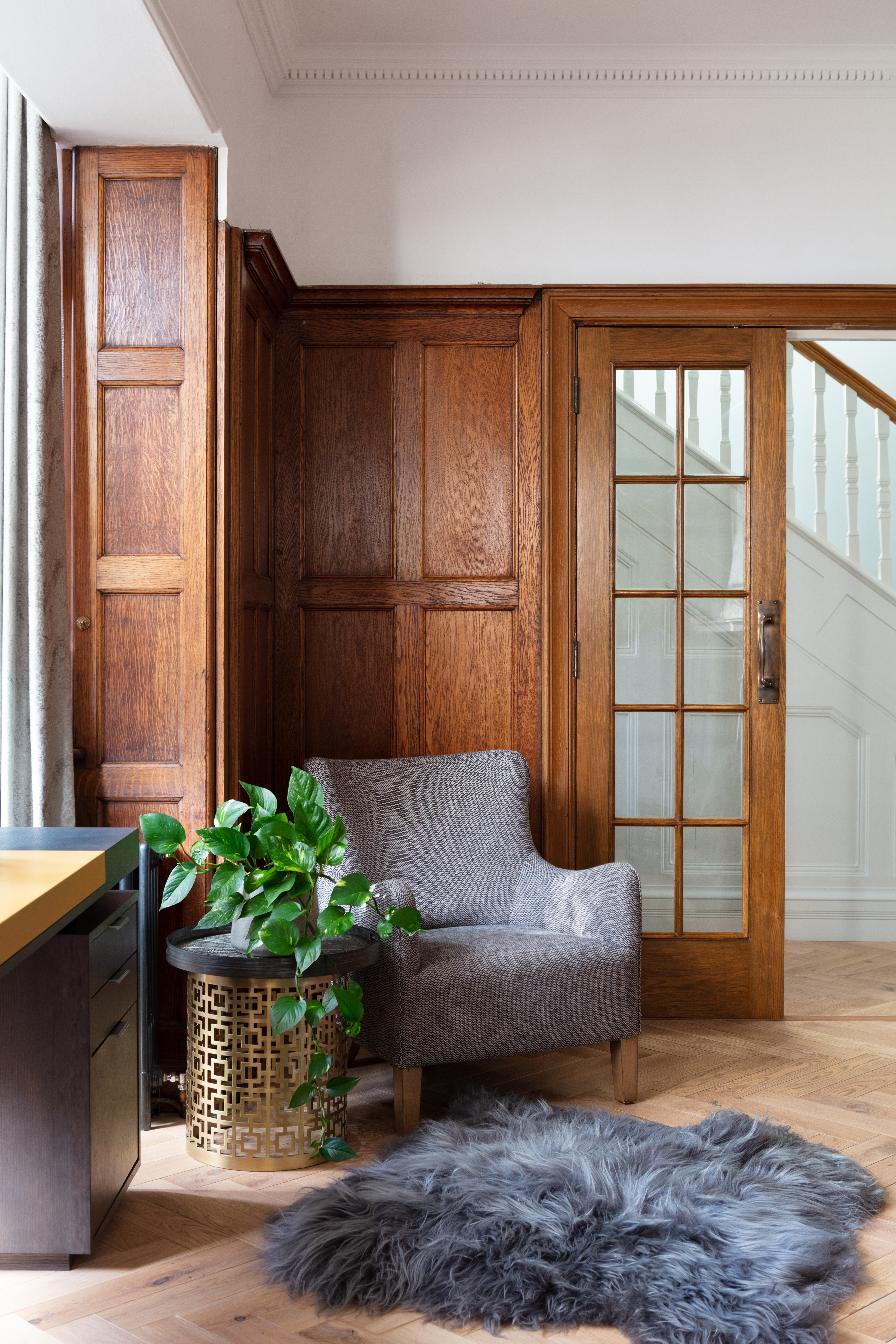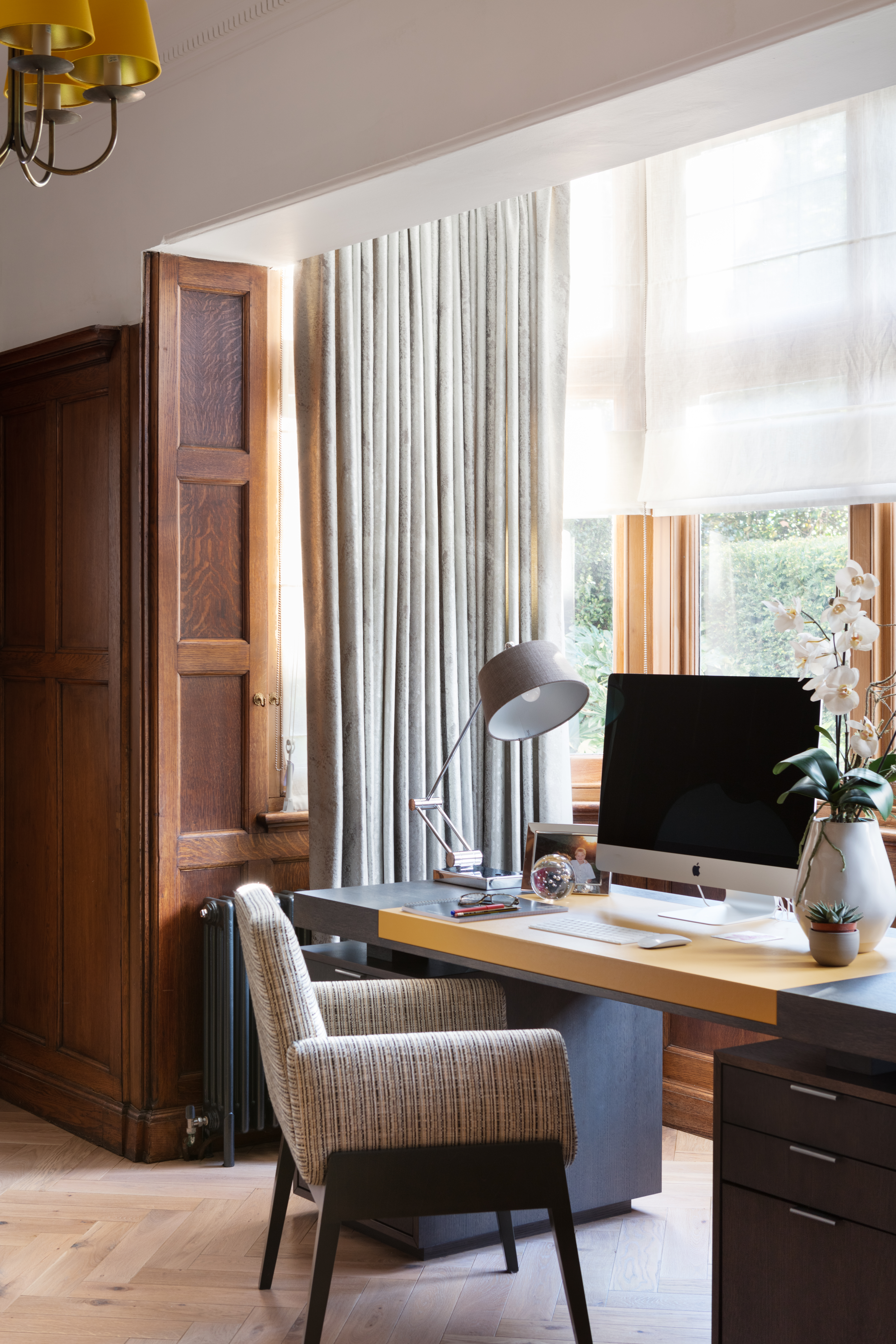 Our client brief was to incorporate and integrate a newly acquired and very bold “Audrey” artwork within a full formal sitting room re-design. This elegant family home on Wimbledon Common already contained some wonderful Edwardian features, but was rather bland and dated, and so a more contemporary ambience was achieved with the application of textured linen wallpaper, a neutral palette of soft textured fabrics, and vivid pops of colour on soft and hard furnishings to create balance with the painting. The inter-connecting wood panelled study underwent a similar transformation, with the introduction of bold mustard flashes within the bespoke joinery