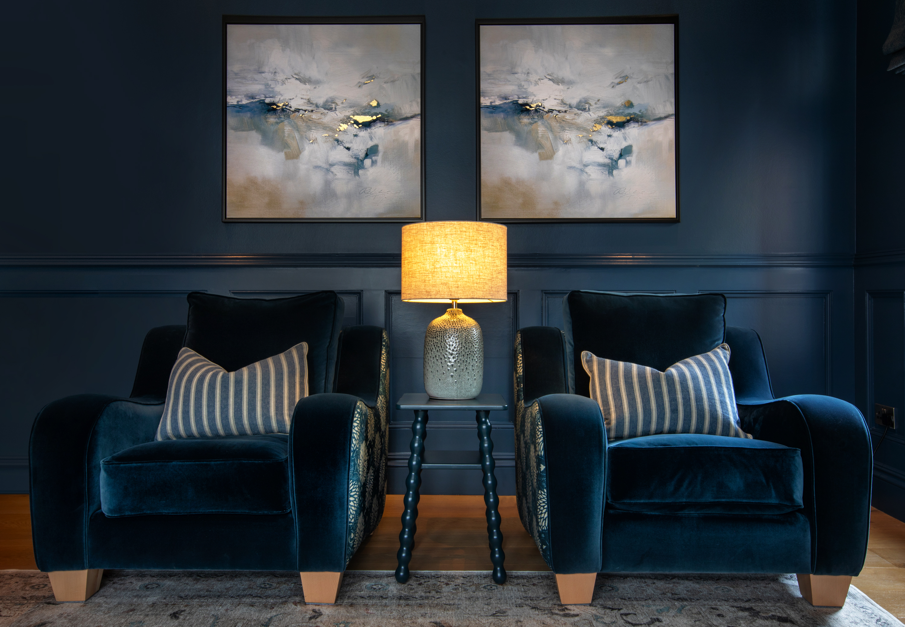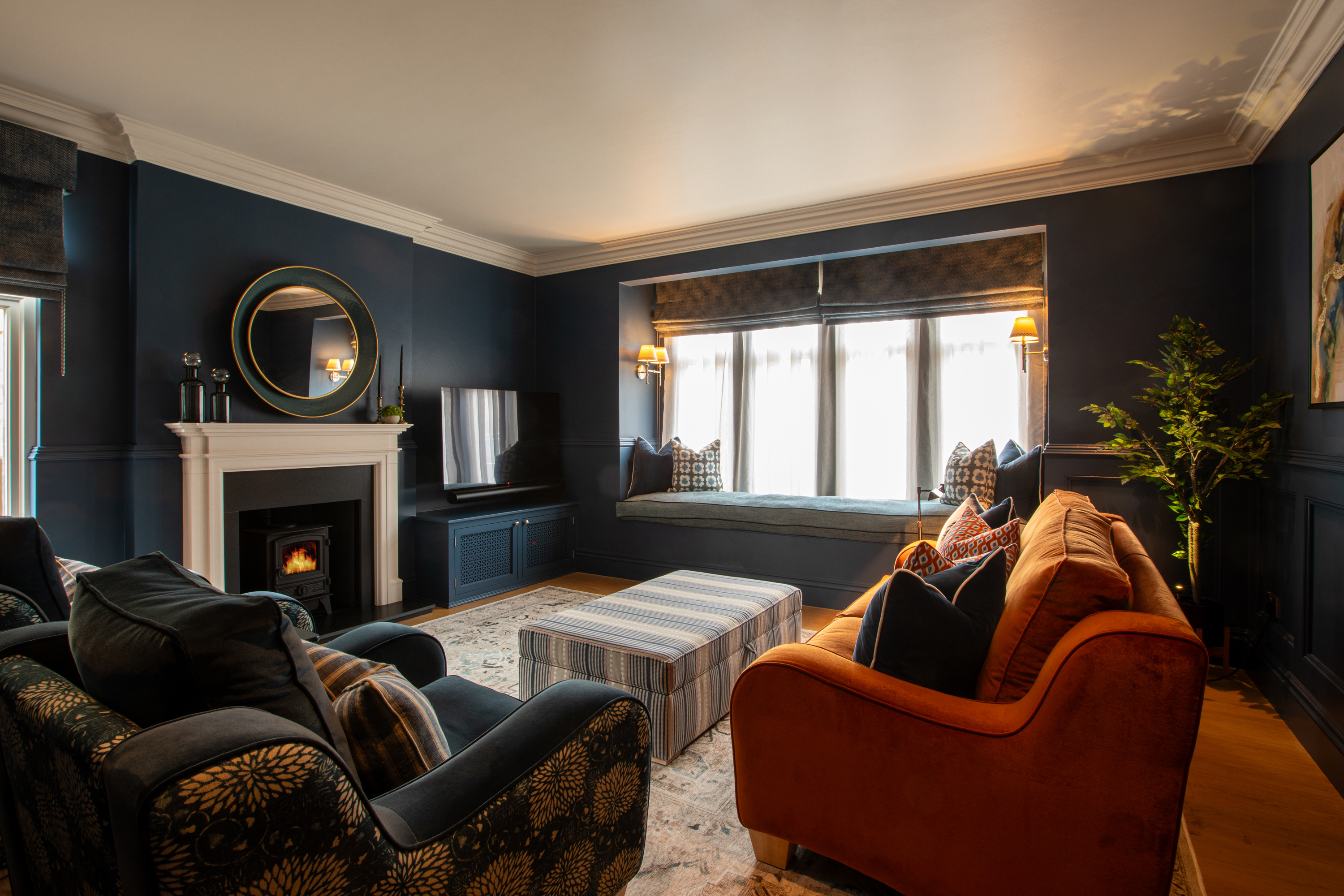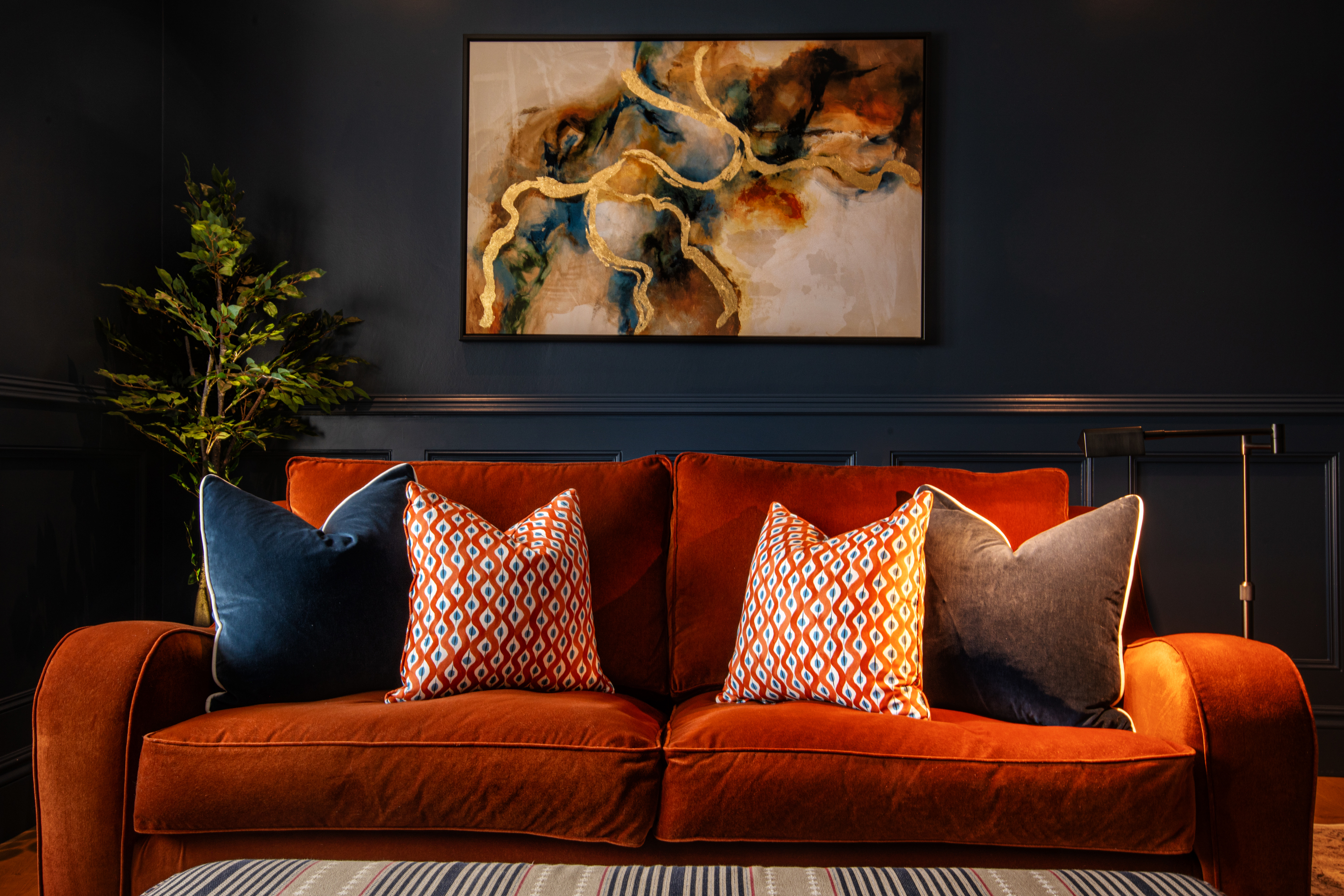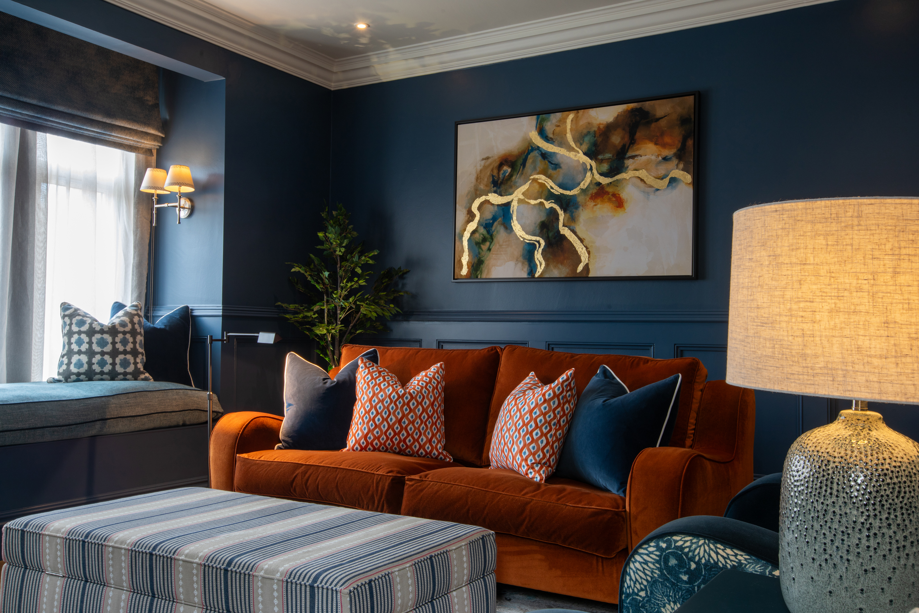 We transformed this dated lounge into a cosy snug with deep blue panelled walls, new flooring, new fireplace, new lighting and furniture and accessories. The contrast burnt orange with the layers of patterns and artwork really make it all pop.