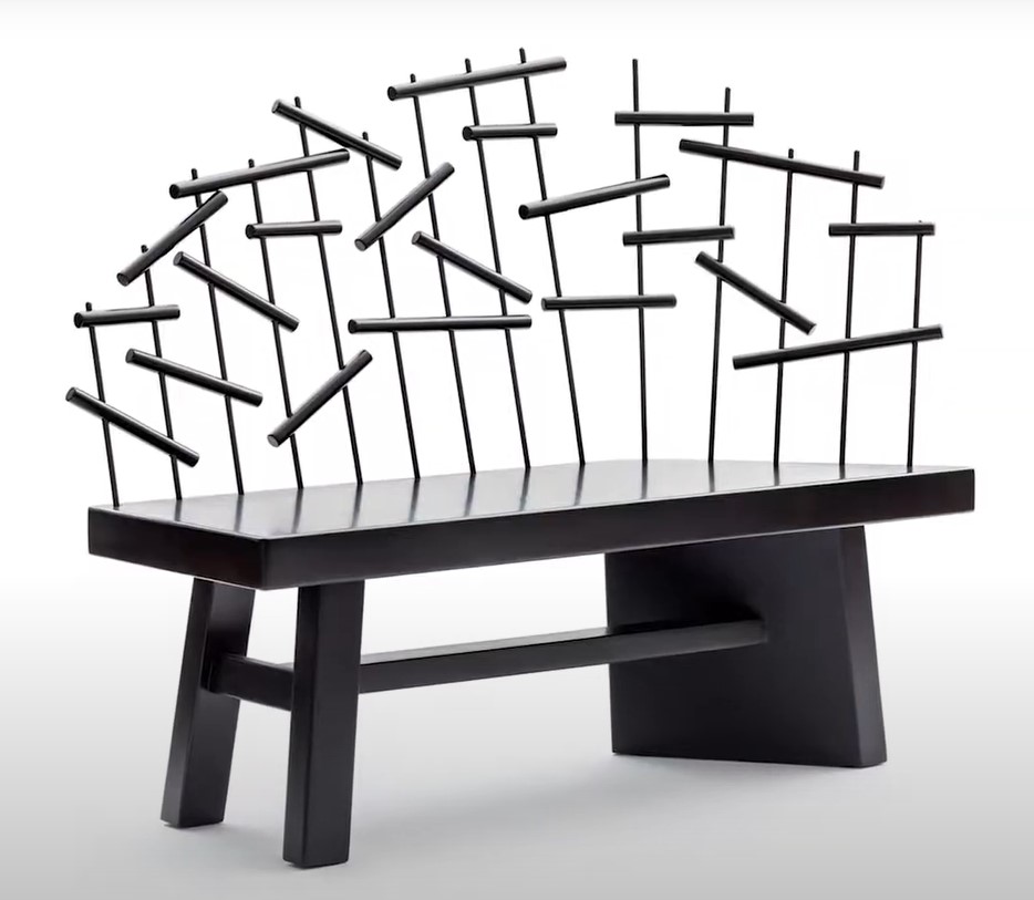 Fie’s entirely black furniture emerged from her simple two-dimensional sketches. The idea is that it should be transformative, like a shadow changing shape depending on where in the room one stands. The back’s floating spindles are inspired by the shape and movement of a mobile, firing the observer’s imagination.
